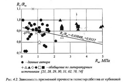 По сравнению с конструкционными легкими бетонами теплоизоляционный полистиролбетон, так же как и ячеистые бетоны, имеет более высокое отношение призменной прочности к кубиковой. Это отражает общую тенденцию, предусмотренную формулой (4.1), увеличения относительной призменной прочности с уменьшением кубиковой. Полученные в ряде случаев зна чения коэффициента призменной прочности более единицы, по-видимому, можно объяснить имевшим место при испытаниях неравномерным сжатием кубов, что снижало их сопротивление по сравнению с центрируемыми при испытаниях призмами (рис. 4.2). Из представленных на рис. 4 2 опытных данных следует, что зависимость призменной прочности полистиролбетона от кубиковой может быть аппроксимирована выражением