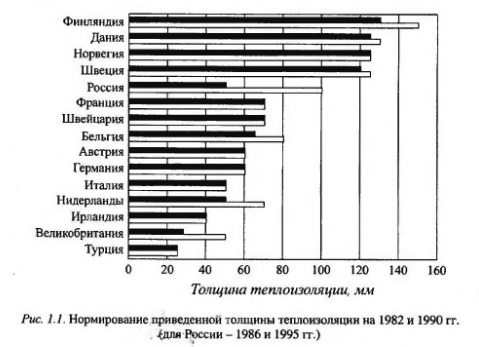 Совершенствование теплозащитных требований к ограждающим конструкциямС целью экономии топливно-энергетических ресурсов на эксплуатацию с 1 января 2000 года для вновь строящихся зданий вступили в действие требования второго этапа энергосбережения, определенные Изменениями № 3 к СНиП П-3-79 «Строительная теплотехника». Согласно этим требованиям приведенное сопротивление теплопередаче стен, покрытий, а также перекрытий чердачных, над холодными подпольями й подвалами повышено в 1,2... 1,75 раза по сравнению с первым этапом, а в целом по сравнению с ранее действующими нормами - в 3...3,5 раза. Это повлекло за собой переоценку всех существующих конструктивных решений ограждающих конструкций с целью повышения теплоизоляционных свойств и обеспечения эксплуатационной долговечности. Как известно, большинство теплопотерь в зданиях (до 68%) происходит через ограждающие конструкции. Из них до 67% - через несветопрозрачные (45% - через стены, 22% - через чердак и полы) и 33% через светопрозрачные - окна и двери. Для установления новых нормативов теплозащиты зданий было предусмотрено снижение удельного энергопотребления на втором этапе до 40% для всех типов зданий. До принятия новых норм в целом по России расходы на отопление составляли 55 и на горячее водоснабжение 19, т.е. суммарно 74 кг у.т./(м2 год). Для сравнения: в Германии этот показатель составляет 34, Швеции и Финляндии - 18 кг у,т./(м2 год), что очевидно значительно меньше, чем в нашей стране. По данным Европейской ассоциации производителей теплоизоляционных материалов при сравнении относительных уровней приведенных толщин теплоизоляции наружных ограждений (при коэффициенте теплопроводности 0,05 Вт/(м2-°С) Россия в 1986 году была на уровне западных стран 1982 года, а в 1990 году, оставаясь на неизменном уровне, она была уже на уровне только южных стран (рис. 1.1). При этом вплоть до 1995 года нормативы в нашей стране оставались неизменными, а затем их стремительный рост форсировал стремительную перестройку строительной индустрии на применение энергоэффективных конструкций. При переходе к новым требованиям традиционные однослойные конструкции оказались нерациональными из-за большого расхода материалов и существенного увеличения их толщины и, как следствие, массы. Так, например, для условий Москвы толщина стен жилых зданий из пустотелого кирпича (у = 1400 кг/м) должна быть увеличена до 2,02, полнотелого кирпича (у = 1800 кг/м3) - 2,55, панелей из керамзитобетона (у = 900 кг/м3) - 1,2 м. При этом потребуется не только корректировка проектов зданий, но также использование кранов и транспортных средств большей грузоподъемности в массовом сборном строительстве, а на производстве - изменение опалубочных форм. Отсюда следует, что применять кирпич и керамзитобетон в соответствии с новыми нормами целесообразно только в конструкционных слоях ограждающих конструкций.