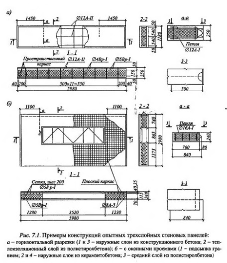 Стеновые панелиРазработаны альбомы рабочих чертежей различных типов опытных трехслойных стеновых панелей, включая панели горизонтальной разрезки, укрупненные стеновые панели с оконными проемами для производственных сельскохозяйственных зданий и панели вертикальной разрезки (плоские и ребристые). Основная номенклатура конструкций рассчитана на их применение в I—IV ветровых районах и предназначена для стен одноэтажных и многоэтажных зданий. Ряд конструкций запроектирован для конкретных регионов (Московская область, г. Челябинск, Узбекистан и др.) и объектов (например, адмбыткомбинат Анненского рудника в г. Джезказгане). Альбом рабочих чертежей «Панели стеновые трехслойные с теплоизоляцией из полистиролбетона, монолитно-связанного с несущими слоями, для стен отапливаемых производственных зданий горизонтальной разрезки» включает номенклатуру конструкций, предназначенных под нормативные ветровые нагрузки от 0,5 до 2,5 кН/м2 (50...250 кге/м2) при расчетной нагрузке от веса переплетов 2,5 кН/м (250 кге/м2). Длина панелей находится в пределах 580...6530, высота - 880...1780, толщина определяется теплотехническим расчетом, но принимается не менее 250 мм, исходя из конструктивных требований. Толщины внешнего (с наружной стороны здания) и внутреннего (со стороны помещения) слоев из тяжелого бетона класса по прочности на сжатие В25 соответственно составляют 50 и 70 мм. Для региональных климатических условий г. Челябинска и с учетом наличия местной сырьевой базы в развитие альбома «Опытные трехслойные стеновые панели с утеплителем из полистиролбетона для производственных зданий»), выпущенного ЭКБ ЦНИИСК, в КТБ НИИЖБ разработан альбом рабочих чертежей «Панели опытные стеновые трехслойные шлакопемзобетонные с утеплителем из полистиролбетона для производственных зданий ОЗЛБ 161.2.86.КЖИ», где предусмотрено использование в наружных слоях панелей шлакопемзобетона на основе заполнителей из отходов металлургической промышленности. Панели предназначены для промышленных зданий с температурой и относительной влажностью воздуха в помещении соответственно 18°С и 60% и рассчитаны под нормативное значение ветрового давления 0,38 кН/м (38 кг/м2). Длина панелей составляет 6, высота - 1,2, толщина - определяется теплотехническим расчетом, но составляет не менее 0,25 м по конструктивным требованиям. Наружные слои их запроектированы толщиной 50, а средний теплоизоляционной - не менее 150 мм (рис. 7.1 а). В зданиях агропромышленного комплекса наиболее нагруженными являются стеновые панели холодильников при навальном хранении сельскохозяйственной продукции. Одновременно к ним предъявляются высокие требования к термическому сопротивлению. Для региональных условий Узбекистана разработан альбом рабочих чертежей «Панели опытные стеновые трехслойные с наружными слоями из тяжелого или легкого бетона и утеплителем из полистиролбетона для зданий холодильников в УзССР». В него включены чертежи основного стенового элемента плодоовощехранилищ - панели длиной 6, высотой 1,2 и толщиной 0,65м, обеспечивающей восприятие хранимой навальным способом продукции и давление ветра, а также требуемое сопротивление стен теплопередаче. Панель запроектирована под ветровую нагрузку, соответствующую IV ветровому району при нормативном значении ветрового давления 0,48 кН/м (48 кгс/м2) и боковом да