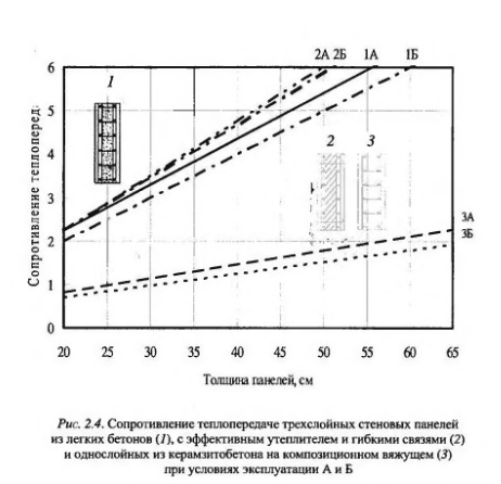 Стеновые панелиДля оценки полученных расчетных значений сопротивления теплопередаче различных типов трехслойных панелей с теплоизоляционным слоем из низкотеплопроводного легкого бетона проведено их сравнение с ограждающими конструкциями, которые широко применяются в современном строительстве. В качестве аналогов стеновых панелей полосовой разрезки использованы конструкции серии 1.432-12-80 «Стены из железобетонных трехслойных панелей на гибких связях с эффективным утеплителем для зданий с нормальным и влажным режимом, в том числе с расчетной сейсмичностью 7, 8 и 9 баллов», а также панели серии 1.030.1-1 «Стены наружные из однослойных панелей для каркасных общественных зданий, производственных и вспомогательных зданий промышленных предприятий». Трехслойные панели серии 1.432-12-80 запроектированы с наружными слоями из тяжелого бетона класса прочности В 12,5 (M150) на портландцементе толщиной 10 и 5 см, а средним - из полистирольного пенопласта плотностью 100 кг/м . При определении сопротивления теплопередаче трехслойных железобетонных конструкций с гибкими металлическими связями коэффициент теплотехнической однородности принят равным 0,8 и отнесен к утеплителю. Однослойные панели серии 1 030.1-1 запроектированы из керамзитобетона класса прочности В3,5 (М50) средней плотности 1100 кг/м с улучшенными теплофизическими характеристиками. Сопротивление теплопередаче однослойных панелей даже с улучшенными теплофизическими характеристиками при толщине 25...65 см в 1,95...3,46 раза меньше, чем трехслойных (рис. 2.4). Их использование для удовлетворения требований второго этапа теплозащиты зданий нецелесообразно - резко возрастает материалоемкость стен за счет увеличения их толщины, а также расход энергии на их изготовление. Это может привести к необходимости замены парка существующих металлических форм, а в ряде случаев - кранового оборудования и реконструкции транспортных средств.
