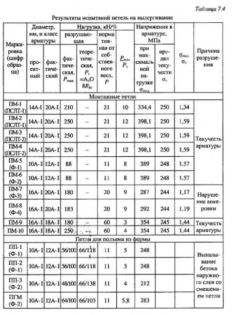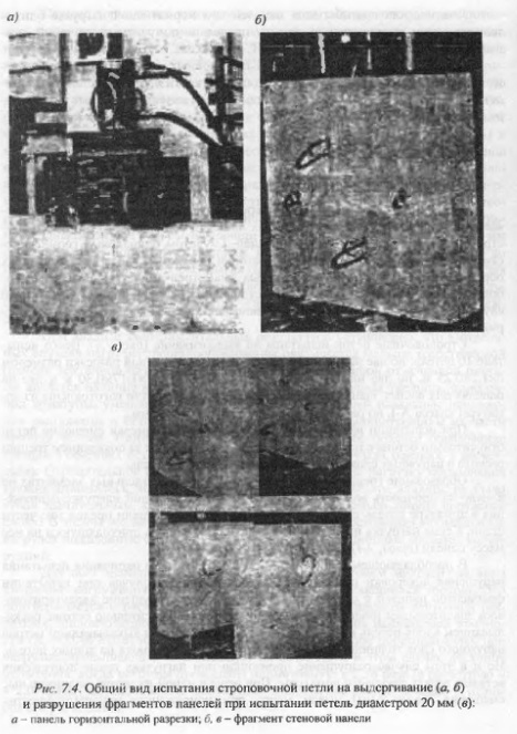 Строповочные петлиДля исследования надежной анкеровки строповочных петель, устанавливаемых в наружных слоях трехслойных панелей, использованы натурные конструкции и фрагменты стеновых панелей. С учетом одинаковых геометрических и прочностных характеристик бетонов наружных слоев для отдельных образцов произведена замена проектных диаметров арматуры петель на наибольшие, предусмотренные в соответствующей серии (наиболее невыгодный случай). При анализе принималась во внимание и максимальная масса односерийных панелей. Строповочные петли испытаны на выдергивание (рис. 7.4). Всего испытано 10 петель: по две на каждой из двух панелей ленточной разрезки размером 6x1,2x0,25 м, по две на двух фрагментах размером 1,2x1,17x0,30 м и две на панелях для жилых зданий размером 4x3x0,30 м Все петли изготовлены из арматуры класса А-I, но различного диаметра - 12,18 и 20 мм. При испытании нагрузку увеличивали этапами, измеряя смещение петли относительно бетона с помощью индикаторов и наблюдая за появлением трещин раскола в наружных слоях панели в местах установки петель. Образование трещин около монтажного гнезда в отдельных элементах не влияло на прочность анкеровки петель. При максимальной нагрузке напряжения в арматуре петель существенно (до 1,57 раз) превышали предел текучести стали, а сама нагрузка на петлю многократно превышала приходящуюся на нее массу панели (табл. 7.4). В преобладающем большинстве случаев вплоть до окончания испытания нарушения анкеровки петель не было, кроме одного случая при испытании фрагментов панелей с петлями диаметром 20 мм. Разрушение характеризовалось значительным (более 1 см) смещением петель относительно бетона, раскалыванием вдоль петель наружного слоя толщиной 7 мм и выкалыванием бетона наружного слоя толщиной 5 см в месте расположения крюка на концах петель. Но и в этом случае разрушение произошло при нагрузках после достижения ветвями петель текучести арматуры. При этом в одной из петель значительные смещения (более 2 мм) имели место при напряжениях меньше текучести.