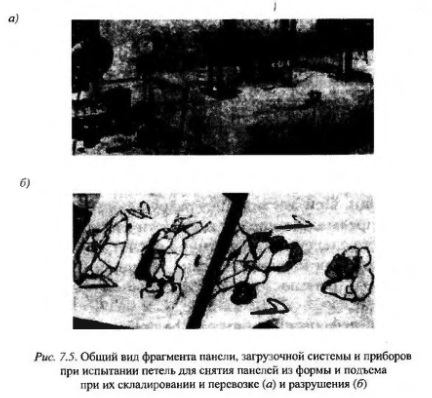Петли для снятия панелей из формы, а также подъема при их складировании и перевозке испытаны на фрагментах стеновых панелей размером 1,20x1,17x0,3 м. при сохранении проектного армирования и расстояния от края панели до петли, равного 25 см. Петли выполнены из стали класса А-I диаметром 12 вместо 10 мм по проекту. Всего испытано четыре петли (см.рис. 75).