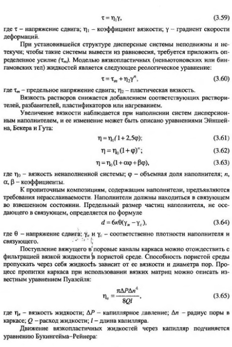Еще одним фактором, оказывающим влияние на процесс пропитки каркаса, являются реологические параметры связующего (матрицы), где определяющую роль играют вязкость и расслаиваемость. Реология как физика деформации устанавливает взаимосвязь между силами, действующими на материальное тело, и вызванными ими деформациями. Большая часть материалов, исследуемых реологией, представляет собой дисперсные системы, состоящие из двух или более фаз. С точки зрения реологии дисперсные системы можно разделить на золи, которые ведут себя как жидкости, на студни, обладающие свойствами твердых тел, и на гели, занимающие промежуточное положение Золи по механическим свойствам относятся к свободнодисперсным системам, которые подвижны и не оказывают сопротивления сдвигу. Гели и студни являются связнодисперсными системами, которые характеризуются наличием пространственной структуры. Структурированные системы при механическом воздействии на них, например при вибрировании или перемешивании, теряют структуру и переходят в свободнодисперсные, а после снятия нагрузки вновь приобретают структуру. Свободнодисперсные системы подразделяются на ньютоновские жидкости, а связнодисперсные - на неныотоновские или вязкопластичные. Течение ньютоновских жидкостей изучается на основе закономерностей классической гидродинамики, а неныотоновских - реологией. Ньютоновские жидкости характеризуются линейной зависимостью напряжения сдвига от скорости деформаций: