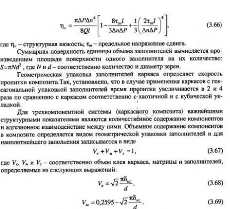 Основным показателем, определяющим качество структуры каркаса, служит его пропускная способность, позволяющая заполнить поровое пространство связующим. Поступление его в поровые каналы каркаса отождествляется с фильтрацией вязкой жидкости в пористой среде. Крупный заполнитель в каркасе рассматривается как фиктивная пористая среда, если считать зерна шарами одинакового диаметра. Основной характеристикой такой среды является пористость, которая определяется типом укладки зерен заполнителя. Так, при кубической укладке ее величина составляет 0,4764 при гексагональной - 0,2595, а при тетраэдрической - 0,6599. Создание каркасных композитов связано с движением жидкостей (связующих). Характер протекания данных процессов при склеивании заполнителей в каркас, пропитке заполнителей и каркаса клеевыми и матричными композициями, а также при обеспечении устойчивости матричных композиций против расслаивания определяется законами и явлениями гидродинамики и гидростатики. Для пропитки каркаса используют как ненаполненные, так и наполненные композиции. При использовании наполненных композиции качественная пропитка композита возможна лишь тогда, когда размеры наполнителя матрицы будут находиться в определенном соотношении с размерами его поровых каналов. Полученная зависимость, определяющая данное соотношение, имеет вид