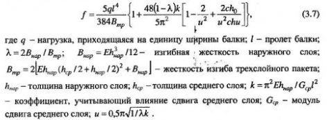 В формуле (3.7) произведение первого сомножителя и первого слагаемого из фигурных скобок представляет собой прогиб от изгиба, а первого сомножителя и второго слагаемого - прогиб от поперечной силы. Расчет с использованием гипотезы сплошности сечения может осуществляться после приведения сечения трехе тойного элемента к двутавровому, исходя из отношения модулей упругости наружных и среднего слоев. Полный прогиб элементов определяется суммой прогибов, обусловленных деформациями изгиба и сдвига. Поскольку касательные напряжения распределены неравномерно по сечению, то для вычисления потенциальной энергии, накопленной в элементе при действии этих напряжений, применен дифференциальный путь. Прогиб балки от поперечных сил находится по формуле