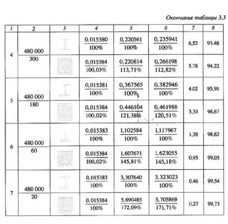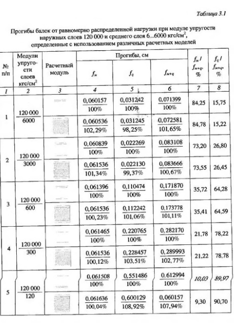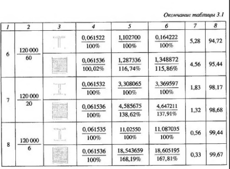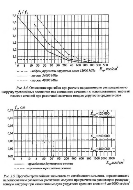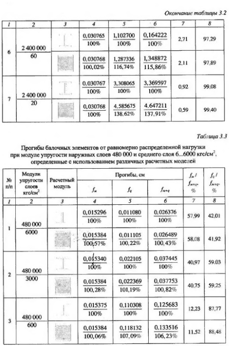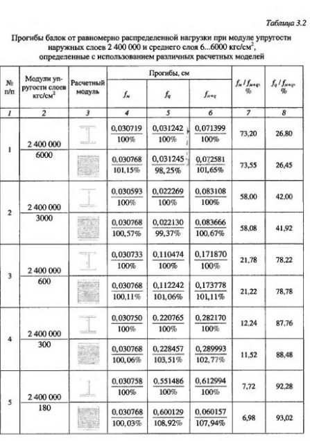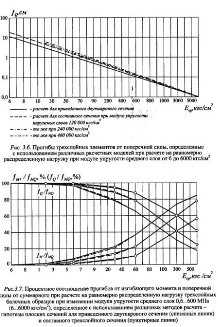 В таблицах 3.1-3.3 и на рисунках 34-37 приведены результаты расчетов трехслоиных железобетонных элементов как составных конструкций и приве денного двутаврового сечения. Анализ результатов расчетов выявил, что при практически возможных величинах начальных модулей упругости бетона наружных слоев и полистиролбетона среднего слоя (прочностью от 5 кгс/см и выше) результаты расчета изгибаемых конструкций как трехслойных с учетом сдвига слоев по высоте сечения и с учетом гипотезы плоских сечений как балок, приведенных к двутавровому сечению, дают практически одинаковые результаты - отличия в прогибах не превышают 1%. При этом прогибы от сдвига за счет поперечных сил при расчете как трехслойных конструкций и как балок двутаврового сечения также близки между собой - отличия в пределах 2%. Для определения прогиба от поперечных сил трехслойных конструкций с приведением их к двутавровым, исходя из отношения начальных модулей упругости среднего и наружных слоев, может использоваться решение, учитывающее неравномерность распределения сдвигающих сил по сечению.