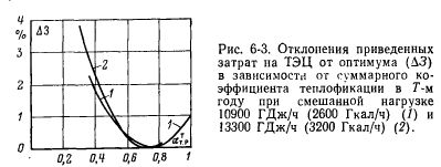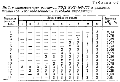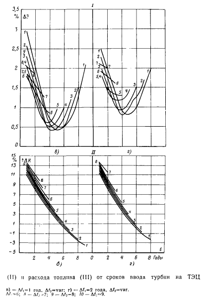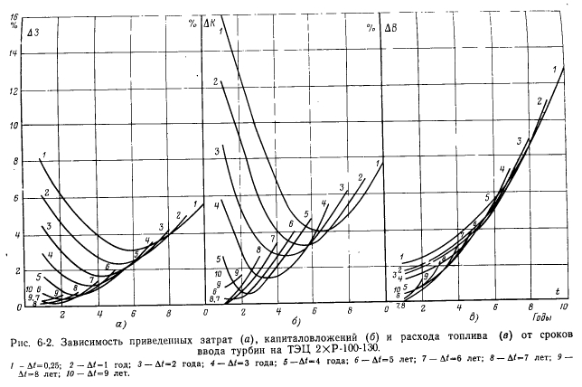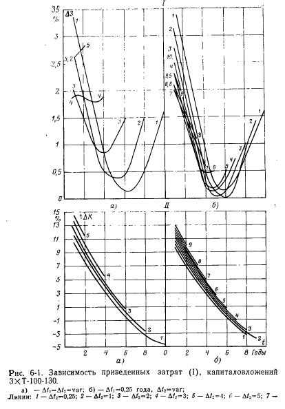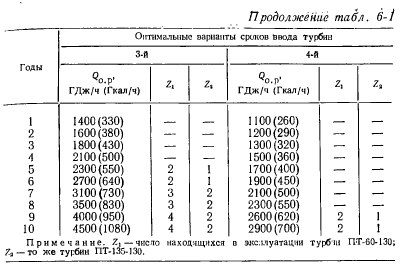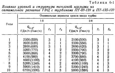 ОПРЕДЕЛЕНИЕ ОЧЕРЕДНОСТИ ВВОДА ОСНОВНОГО ОБОРУДОВАНИЯ ТЭЦДля паротурбинных ТЭЦ, работающих на органическом топливе и получивших большое распространение в СССР, важными являются вопросы определения оптимальной единичной мощности, состава и сроков ввода основного оборудования, соотношения между тепловой и электрической мощностью, выражающегося расчетным коэффициентом теплофикации. До сих пор эти вопросы рассматривались, как правило, без учета постепенности роста тепловых и электрических нагрузок. Поэтому важно, с одной стороны, оценить степень влияния этого фактора для выработки рекомендаций по оптимальным единичным мощностям и областям применения основного оборудования ТЭЦ, а с другой стороны, учесть его при конкретном проектировании. Для определения оптимальной очередности и сроков ввода основного оборудования ТЭЦ проводились расчеты, в которых в широком диапазоне варьировались исходные данные и для каждого их сочетания находилось решение. В качестве объектов оптимизации рассматривались ТЭЦ, оборудованные турбинами типов Т, IIT и Р, энергетическими котлами производительностью 420 и 950 т/ч, пиковыми паровыми котлами (на низкие параметры пара) теплопроизводительностью 550 ГДж/ч (130 Гкал/ч) и водогрейными котлами ПТВМ-100 и ПТВМ-180. Расчеты проводились применительно к климатическим условиям Ленинграда, Москвы и Иркутска. Продолжительность использования технологической тепловой нагрузки принималась равной 4500— 7500 ч, отопительно-бытовой нагрузки (с учетом доли нагрузки горячего водоснабжения 20%) 3500—3900 ч, а коэффициент их среднегодового прироста в течение 10-летнего периода варьировался в диапазоне 5—15 для отопительно-бытовой и 10—20% для технологической нагрузок. Капиталовложения, связанные с установкой на ТЭЦ первых и последующих турбин, энергетических, пиковых водогрейных котлов, принимались по нормативным данным. Поскольку в настоящее время не выпускаются пиковые паровые котлы большой теплопроизводительности, капиталовложения, связанные с их установкой, определялись экспертным путем. На основе специально проведенных расчетов (см. § 6-5) установлено, что оптимальная теплопроизводитсльность пиковых паровых котлов составляет около 550—630 ГДж/ч (130— 150 Гкал/ч). При выборе числа энергетических котлов учитывалось ограничение по допустимому снижению электрической мощности ТЭЦ (с поперечными связями) в аварийных условиях [48]. Для вариантов развития ТЭЦ, предусматривающих ввод в первые годы пиковой котельной, учитывались дополнительные капиталовложения, которые относились на первый водогрейный или паровой котел. Их учет вызван тем, что при первоочередном вводе на площадке ТЭЦ пиковой котельной строительные работы по освоению и подготовке территории производятся в целом для теплоэлектроцентрали. Замыкающие затраты на топливо (газ, мазут, уголь) и электроэнергию варьировалась с учетом рекомендаций [56]. В качестве примера на рис. 6-1, 6-2 показана область возможных решений по срокам ввода основного оборудования ТЭЦ при разных типоразмерах теплофикационных турбин. Она получена при учете нормативных данных по капиталовложениям в ТЭЦ, разработанных ВТПИ Теплоэлектропроект, и замыкающих затрат на топливо для энергетических и водогрейных котлов (мазут) 20 руб/т у. т. и на электроэнергию от ОЭЭС 10 руб/(МВт-ч). Построения рис. 6-1