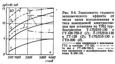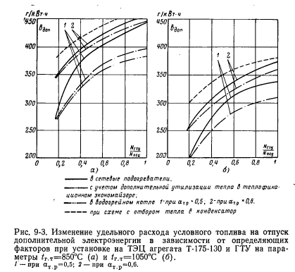 ОПТИМИЗАЦИЯ ПРОФИЛЯ И СОСТАВА ОСНОВНОГО ОБОРУДОВАНИЯ ПАРОГАЗОВЫХ УСТАНОВОКПри рассмотрении комбинированной парогазовой установки как объекта оптимизации, прежде всего, важно учесть возможность получения на ней маневренной мощности, наличие которой оказывает существенное влияние на выбор тепловой схемы и основных параметров энергоустановки. При этом необходимо исходить из условия, что дополнительная мощность при совместной работе паровых и газотурбинных установок по маневренности не должна уступать автономной установке ГТУ и ее получение не должно приводить к уменьшению надежности паротурбинного оборудования. Поэтому целесообразен отказ от параллельной схемы подогрева питательной воды, принятой в ПГУ рассмотренных выше типов, и осуществление включения экономайзера высокого давления по тракту питательной воды до ПВД. При номинальной загрузке ТЭЦ по теплу наибольшего внимания заслуживает вариант схемы с отводом вытесненного пара в сетевые подогреватели. Это связано с тем, что реализация большего прироста электрической мощности паровых турбин при отводе пара в конденсаторы потребует эксплуатации градирен в течение 2—4 или 16—18 ч/сут (в зависимости от требуемого режима работы по электрическому графику) с отключением на остальное время суток, что является недопустимым по условиям обледенения в зимний период для современных; типов градирен. Расчеты показывают, что увеличение электрической мощности турбин типа Т-250-240 составит около 10%, других турбин типа Т на параметры 13 МПа (130 кгс/см2), 555°С — 6% и турбин типа ПТ — 1,5% при отводе вытесненного пара регенеративных отборов в сетевые подогреватели при одновременном увеличении тепловой мощности на 15—25%. Увеличение электрической мощности для турбин указанных типов при отводе вытесненного пара в конденсаторы составит около 14, 10 и 7% соответственно. ![]() На показатели тепловой экономичности маневренной мощности ТЭЦ, кроме места отвода вытесненного пара регенеративных отборов, существенное влияние оказывает еще ряд факторов, к главным из которых относятся соотношение мощностей газовой и паровой ступеней цикла, характеристики газотурбинных агрегатов, длительность использования маневренной мощности и степень утилизации тепла уходящих газов ГТУ. Влияние основных из указанных факторов на тепловую экономичность при длительности использования маневренной мощности 2000 ч/год показано на рис. 9-3. Из его построений следует, что маневренная мощность на ТЗЦ может характеризоваться большим диапазоном значений удельного расхода топлива на отпуск электроэнергии (220—450 г у. т./кВт-ч). Это свидетельствует о необходимости выбора основных характеристик комбинированных блоков на основании технико-экономического анализа. При рассмотрении использования в составе блока ГТУ, выполненных по сложным схемам, необходимо решение вопроса об утилизации тепла воздухоохладителей. Применительно к открытым схемам теплоснабжения эта задача может быть решена с использованием тепла воздухоохладителей обеих ступеней для подогрева сырой и деаэрированной подпиточной воды теплосети. Использование тепла воздухоохладителей обеспечит дополнительную экономию топлива на ТЭЦ за счет большего вытеснения водогрейных котлов. Однако это будет сопровождаться увеличением температуры сетевой воды н