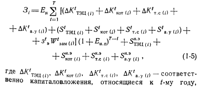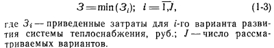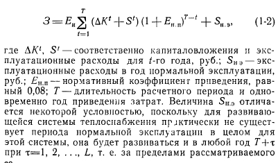 ОСОБЕННОСТИ ОПТИМИЗАЦИИ СИСТЕМ ТЕПЛОСНАБЖЕНИЯХарактеристика основных задач. Отличительными особенностями задач оптимизации систем теплоснабжения являются: 1) сложность и многообразие внешних и внутренних взаимосвязей, как это следует из построений рис. 1-1; 2) необходимость учета фактора времени, что определяется свойствами систем теплоснабжения; 3) неоднозначность большей части исходной информации, используемой при оптимизации систем теплоснабжения (подробнее об этом см. гл. 5), возрастающая по мере увеличения длительности расчетного периода; 4) соответствие допустимой точности решения задач, а следовательно, и точности разрабатываемых методов с точностью учитываемых показателей. Как будет показано в гл. 5, точность исходных данных снижается по мере увеличения длительности рассматриваемого периода, т. е. расширяется диапазон их возможных изменений. Критерий оптимизации. В соответствии с общепринятой в СССР методикой технико-экономических расчетов в энергетике [46] при оптимизации систем теплофикации и централизованного теплоснабжения в/ качестве критерия принимаются приведенные затрат 3, руб., которые определяются по следующим выражениям: 1) при статической постановке задачи, когда сооружение и освоение производительности входящих в систему теплоснабжения энергетических объектов осуществляются в течение одного года и в последующем их показатели остаются неизменными, т. е. когда не учитывается постепенность роста тепловых и электрических нагрузок города или промышленного центра по годам расчетного периода: ![]() 2) при динамической постановке задачи, когда рассматривается развитие системы теплоснабжения в течение заданного периода и учитываются изменения по годам этого периода уровней тепло- и электропотребления города или промышленного центра и разновременность капиталовложений в сооружаемые объекты этой системы: ![]() При наличии ряда вариантов развития системы теплофикации и централизованного теплоснабжения выбор оптимального из них производится по минимуму приведенных затрат ![]() В ряде случаев при сравнении разных вариантов развития системы теплоснабжения по значению приведенных затрат может оказаться, что в этих вариантах некоторые из рассматриваемых объектов остаются неизменными как по своей производительности, так и срокам сооружения. Поэтому относящиеся к ним затраты можно считать постоянными (За) и при сравнении вариантов не учитывать в суммарных затратах, необходимых на развитие системы теплоснабжения. Тогда формула (1-3) примет следующий вид: ![]() Такой методический прием обычно используется в энергетических расчетах. Он позволяет более обоснованно выбрать оптимальное решение, особенно в тех случаях, когда рассматриваемые варианты содержат существенную долю постоянных затрат и в то же время близки по величине суммарных затрат. Применительно к системе централизованного теплоснабжения выражение для определения приведенных затрат в i-и вариант ее развития имеет следующий вид: ![]() Приведение вариантов к равному энергетическому эффекту. Из выражения (1-5) видно, что критерий оптимизации включает не только приведенные затраты в объекты системы теплоснабжения, но и затраты в замещаемую электроэнергию. Необходимость ее учета вызывается требованием приведения всех сравниваемых вариантов к р