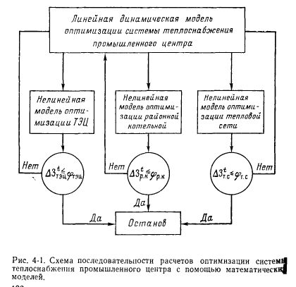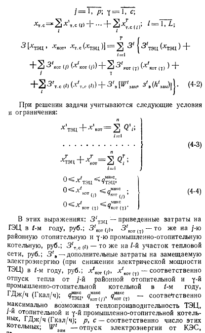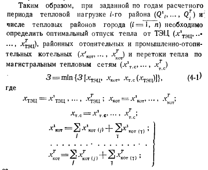 ОСОБЕННОСТИ ПОСТАНОВКИ И МЕТОДЫ РЕШЕНИЯ ЗАДАЧИВышеизложенные методы позволяют выбирать оптимальное решение по развитию источников тепла и тепловых сетей при раздельном их рассмотрении и при заданной (конечной) .производительности этих объектов системы теплоснабжения. Однако на стадии разработки схем теплоснабжения городов и промышленных центров необходимо комплексное рассмотрение разных источников тепла и различных вариантов транспорта тепла от них к потребителям, зависящих от производительности и местоположения этих источников. В результате такого подхода может быть выбрано оптимальное решение как по числу, так и но мощности источников централизованного теплоснабжения и направлениям трасс магистральных тепловых сетей. В общем виде задача комплексной оптимизации развития системы теплоснабжения (на стадии разработки схемы теплоснабжения) может быть сформулирована следующим образом. Задано: тепловые районы города, часовые и годовые нагрузки по каждому из них; часовые и годовые тепловые нагрузки (в паре и горячей воде) крупных промышленных предприятий, их территориальное размещение; число существующих крупных местных котельных, их размещение по территории города и технико-экономические характеристики; возможные новые центральные источники теплоснабжения, их территориальное размещение и предельные производительности; возможные направления трассы водяных и паровых сетей; вид топлива и замыкающие затраты на него для ТЭЦ; отопительных и промышленно-отопительных котельных с учетом затрат на его внутригородские перевозки; варианты состава основного оборудования ТЭЦ на последний год расчетного периода; замыкающие затраты на электроэнергию. Требуется определить: число, вид источников централизованного теплоснабжения, часовой и годовой отпуск от них тепла и электроэнергии; направления трассы водяных и паровых тепловых сетей; минимальные приведенные затраты в теплофикационную систему. ![]() ![]() В настоящее время отсутствуют методы решения рассматриваемой задачи, позволяющие находить абсолютный оптимум. Трудность заключается в необходимости учета: 1) целочисленности, связанной с тем, что число и единичная мощность турбин, котлов, диаметры трубопроводов могут выражаться только целыми числами; 2) нелинейности, вызываемой наличием нелинейных зависимостей капиталовложений от мощности источников теплоснабжения, а также других зависимостей, имеющих нелинейный характер; 3) динамики, т. е. развития теплофикационной системы с учетом постепенности роста тепловых нагрузок по годам расчетного периода. В связи с отмеченным для решения рассматриваемой задачи могут быть применены приближенные методы, которые во всех случаях не гарантируют получения действительно оптимального решения, но найденное с их помощью решение может быть близко к оптимуму или совпадать с ним. Путем варьирования основных исходных показателей можно определить устойчивость полученного решения. Среди таких приближенных методов представляется целесообразным выделить два, которые имеют принципиальные различия. 1. На основании предварительного анализа определяются варианты структуры теплофикационной системы, т. е. число источников централизованного теплоснабжения, мощность каждого из них и перетоки тепла от источников к тепловым района