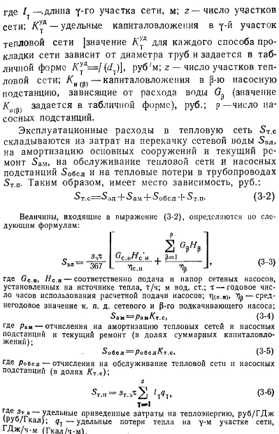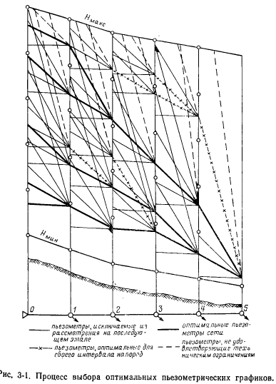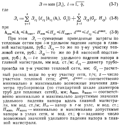 ПОСТАНОВКА И МЕТОДЫ РЕШЕНИЯ ЗАДАЧИ ОПТИМИЗАЦИИ ПАРАМЕТРОВ ТЕПЛОВЫХ СЕТЕЙВ настоящее время в практике проектных организаций полечили широкое распространение упрощенные методы расчета водяных тепловых сетей, при которых схема сети и размещение подкачивающих и дросселирующих подстанций намечаются без оптимизационных расчетов, а диаметры трубопроводов определяются по нормативному значению удельной линейной потери давления— до 78,5 Па/м (до 8 мм вод. ст/м), принимаемой постоянной по направлению главной магистрали. При этом места расположения и параметры подкачивающих и дросселирующих подстанций выбираются на основе инженерной интуиции и опыта проектировщика. Эти методы базируются на фундаментальных исследованиях аналитических методов оптимизации параметров тепловых сетей, выполненных проф. Б. Л. Шифринсоном еще в 30-х годах [76] и впоследствии развитых в трудах других энергетиков [14, 28, 43, 60]; они обеспечивали принятие в достаточной степени оптимальных решений при проектировании тепловых сетей на первых этапах развития систем централизованного теплоснабжения, когда эти системы были сравнительно небольшими. Такие упрощенные методы расчета тепловых сетей могут применяться и в настоящее время при проектировании сравнительно мелких систем теплоснабжения с незначительной протяженностью тепловых сетей. В то же время они не могли в полной мере использовать теоретические положения этих исследований ввиду ограниченных возможностей ручного счета. Зачастую при сравнении комбинированной и раздельной схем энергоснабжения городов и промышленных центров затраты в тепловые сети определяются на основе обобщенных зависимостей капиталовложений в тепловые сети от укрупненных показателей теплоплотности теплофицируемых районов. При использовании таких методов не учитываются постепенность роста тепловых нагрузок потребителей по годам расчетного периода, наличие существующих участков сети и не оптимизируются диаметры по участкам тепловых сетей с учетом технических ограничений на давления в узловых точках сети, различных удельных капиталовложений по ее участкам, что может приводить к существенным просчетам и ошибкам. Применение ЭВМ открывает большие возможности для создания новых, более совершенных и точных методов оптимизации развития тепловых сетей [26, 41, 42, 50, 65]. Задача оптимизации тепловых сетей может решаться как без учета, так и при учете постепенности роста тепловых нагрузок по годам расчетного периода. В случае, если фактор динамики не учитывается, постановка задачи может быть сформулирована следующим образом. Задано: расчетные расходы воды у потребителей; длина участков и конфигурация тепловой сети; область допустимых значений удельного падения напора в главной магистрали; срок службы существующей тепловой сети и диаметры по ее отдельным участкам; шкала стандартов возможных диаметров тепловой сети; допустимый располагаемый напор на вводе у абонентов; технические ограничения на давление в узловых точках сети. Требуется определить: оптимальные значения диаметров по участкам сети; количество, места расположения и параметры подкачивающих и дросселирующих подстанций, соответствующие минимальному значению целевой функции, в качестве которой принимаются приведенные затраты в тепловую сеть Входящие в вели