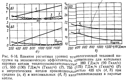 ОПРЕДЕЛЕНИЕ ОПТИМАЛЬНОЙ ЕДИНИЧНОЙ МОЩНОСТИ ПИКОВЫХ КОЗЛОВ ТЭЦВ зависимости от характера технологических процессов отпуск тепла от ТЭЦ или котельных для производственных целей может отличаться большей или меньшей неравномерностью как в суточном, так и в годовом разрезе. Данные проектных организаций показывают, что годовое число часов использования расчетного максимума технологической тепловой нагрузки по отраслям промышленности изменяется от 4000 до 6500 ч, а коэффициент заполнения годового графика потребления тепла на технологию для отдельных крупных промышленных предприятий — от 0,55 до 0,88. В связи с имеющейся неравномерностью потребления тепла для целей технологии возникает задача в определении оптимальных источников покрытия пика и полу- пика его годового графика. Естественно, что установка турбин с противодавлением с большой недогрузкой отборов в данном случае оказывается экономически нецелесообразной. В то же время до сих пор не выпускаются специальные котлы на низкие параметры пара [примерно. 1—1,5 МПа (10—15 кгс/см2)] достаточно большой паропроизводительности. Имеющиеся паровые котлы отличаются малой единичной мощностью и поэтому не могут устанавливаться в качестве пиковых на ТЭЦ или же использоваться для крупных промышленных котельных, где их число может достигать 15—20, что нецелесообразно. Как правило, для покрытия пика графика технологической тепловой нагрузки применяются на ТЭЦ дорогостоящие энергетические котлы, отпускающие тепло через редукционно-охладительные установки (РОУ). Естественно,, что использование таких котлов на ТЭЦ, а тем более в крупных промышленных котельных является вынужденным, временным решением. Для этих целей должны быть разработаны специальные паровые котлы достаточно большой теплопроизводительности. Для оценки эффективности применения таких котлов разной тепловой производительности были проведены расчеты применительно к промышленно-отопительным котельным и ТЭЦ, оборудованным турбинами типа ПТ. Тепловая нагрузка варьировалась в широком диапазоне. Это позволило установить влияние уровней, структуры и темпов роста тепловой нагрузки на оптимальную единичную теплопроизводительность паровых котлов. Тепло- производительность специальных котлов принималась в размере 380, 550 и 750 ГДж/ч (90, 130 и 180 Гкал/ч), а капиталовложения определялись экспертным путем по данным для энергетических котлов соответствующей теплопроизводительности. Варьирование капиталовложений в определенном диапазоне позволяет оценить влияние этого фактор» на выбор оптимальной единичной теплопроизводительности парового котла. ![]() Результаты расчетов, показывающие изменения отклонений приведенных затрат по котельной в зависимости от технологической тепловой нагрузки для рассматриваемых типоразмеров паровых котлов, характеризует рис. 6-16. Из полученных данный следует: 1) применение парового котла теплопроизводительностыо 380 ГДж/ч (90 Гкал/ч) оказывается неэффективным во всем диапазоне изменения технологической тепловой нагрузки; перерасход капиталовложений достигает 5—11%, а приведенных затрат — около 1,5— 2,5 %; 2) в диапазоне тепловой нагрузки Qo.p2900 ГДж/ч (700 Гкал/ч) экономически целесообразна установка паровых котлов теплопроизводительностыо 550 ГДж/ч (130 Гкал/ч), а при больших значениях нагрузки — котлов 
