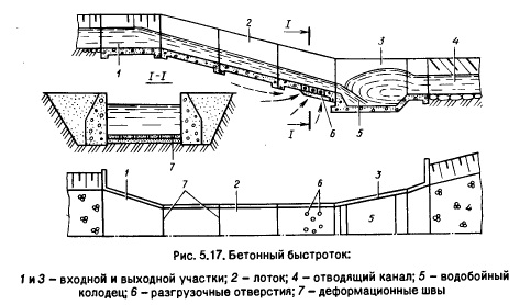 БЫСТРОТОКИВходной участок быстротока (рис. 5.17) представляет собой переход от канала к более узкому участку сооружения - лотку-водоскату. Это в плане сужающийся конус с обратными стенками. Чтобы на подходном к быстротоку участке канала при прохождении расхода менее расчетного ослабить влияние кривой спада, приводящее к местному увеличению скоростей в канале и размыву его дна, если оно не закреплено, входную часть выполняют в виде щелевого или гребенчатого водослива. Длина входного участка зависит от условий его сопряжения с подводящим каналом, она может быть принята в первом приближении (2...3) Н, где Н - глубина в канале.