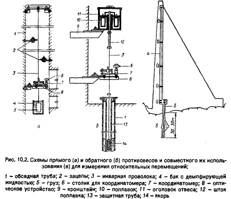 ЭКСПЛУАТАЦИЯ БЕТОННЫХ СООРУЖЕНИЙБетонные сооружения систематически осматривают, выявляя трещины, потеки, налеты и напластования предметов выщелачивания, раковины, пустоты, отслаивания бетона, обнажение арматуры и т. п. Поверхности бетонных сооружений, находящиеся в зоне переменных уровней, осматривают в период пониженных уровней воды летом с лодки. Во время наполнения водохранилища и в первый год эксплуатации общий осмотр сооружений осуществляют ежедневно, в последующие В бетонных сооружениях поверхностью марки размещают на всех секциях береговых устоев и плотины, чтобы можно было оценить осадку сооружения в пространстве, то есть в направлениях оси сооружения и движения потока. На высоких плотинах марки заделывают в бетон низовой грани, ближайшей к основанию незатопляемои смотровой галереи (по одной марке у краев). Кроме того, марки устанавливают в поперечных галереях через 8...10 м на границах межстолбчатых швов [30]. В плотинах, имеющих галереи со стабильной температурой, для измерения перемещений применяют гидростатический нивелир. Прибор представляет собой два сообщающихся сосуда, наполненных водой. По уровню воды судят о вертикальных перемещениях. В период возведения плотины наблюдения за перемещениями проводят не реже двух раз в месяц; в период наполнения водохранилища - ежедневно; в первые годы эксплуатации - два раза в год; в последующие годы в процессе затухания осадок - один раз в год. Нивелирование, проверку приборов и реек, а также ведение записей и обработку результатов выполняют в соответствии с руководством [44]. Для измерения относительных горизонтальных перемещений бетонных плотин используют прямые или обратные отвесы. Прямой отвес (рис. 10.2, а) представляет собой обычный отвес с точкой подвеса в верхней части плотины, в середине или в основании в зависимости от высоты плотины или целей измерения перемещений. Прикрепленный в нижней части груз обычно помещают в емкость, наполненную жидкостью для обеспечения демпфирования (успокоения) колебаний. Размещают отвесы в вертикальных шахтах или специально смонтированных трубах. С помощью координатомера, размещенного над грузом, измеряют перемещения в двух взаимно перпендикулярных направлениях. В однотипных секциях и геологических условиях отвесы располагают примерно через 100 м. В плотинах на нескальном основании прямые отвесы устанавливают через 2...4 секции.