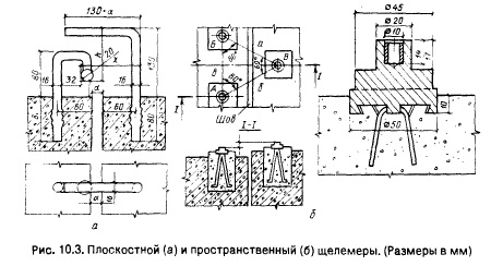 Обратный отвес (рис. 10.2, б) представляет собой натянутую нить, внизу закрепленную с помощью якоря, а вверху поддерживаемую и натягиваемую кольцевым поплавком, погруженным в бак с жидкостью. Якорь омоноличивают в забое скважины. Координатомер в обратном отвесе располагается несколько ниже бака с поплавком. Обратный отвес по своим возможностям более универсальный прибор, так как им одним можно определять перемещения гребня плотины относительно; заданной точки основания и подошвы плотины; точки закрепления якоря отвеса. Зачастую одновременно предусматривают устройство прямых и обратных отвесов (рис. 10.2, в). Значения горизонтальных перемещений отдельных секций находят с помощью натянутой в смотровой галерее нити, закрепленной в крайних секциях. Смещения определяют по маркам, установленным на секциях плотины, относительно нити. Углы наклонов гидротехнических сооружений или их элементов измеряют с помощью нивелирования марок, размещенных на напорной и низовой гранях сооружения. Наблюдения за трещинами в зависимости от их характера, опасности развития, местоположения, размеров проводят: визуально; с помощью маяков из гипса, алебастра, цементного раствора, оргстекла, металла. Степень раскрытия швов обычно измеряют щелемерами. Их подразделяют на склоскостные и пространственные (рис. 10.3), а также на закладные и накладные. Щелемеры подразделяются на плоскостные и пространственные (рис. 10.3), а также на закладные и накладные. Прочность построенных бетонных, железобетонных и металлических сооружений определяют различными методами: разрушающими и неразрушающими [17]. Наибольшее распространение нашли вторые. К неразрушающим методам относятся: ультразвуковые (ультразвуковой, резонансный, поверхностной волны); радиационные (нейтронные, гамма-излучение); электромагнитные (поглощения света высокой частоты, волн, электромагнитной индукции). Ультразвуковой метод нашел наибольшее распространение. Конструкции приборов приведены в работе [17]. Для определения напряженно-деформированного состояния сооружений в основном применяют два способа: тензометрический и непосредственное измерение напряжений с помощью закладных датчиков. Методика их размещения, монтажа и выполняемых при этом наблюдений изложена в работах [17,40].