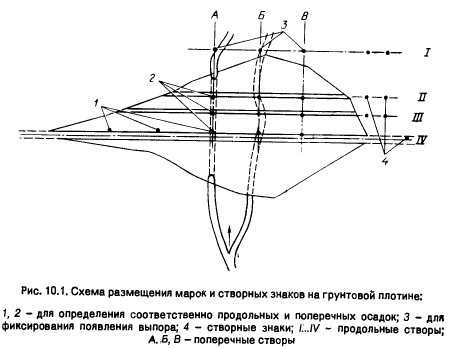 ЭКСПЛУАТАЦИЯ ГРУНТОВЫХ ГИДРОТЕХНИЧЕСКИХ СООРУЖЕНИЙОсновной состав работ во время эксплуатации грунтовых гидротехнических сооружений, как, впрочем, и других - осмотр состояния (визуальные наблюдения), содержание сооружений и контроль за надежностью с помощью приспособлений и КИА. Осмотр состояния позволяет получить предварительное впечатление о работе сооружений и выполняется независимо от их классов. Его проводят в соответствии с инструкцией. При этом в журналах визуальных наблюдений зарисовывают, описывают дефекты, отклонения и нарушения, делают их схемы, эскизы и фотографии. Кроме того, указывают дату, место их нахождения, привязку, размеры, предположительные причины возникновения, принятые меры и предложения. В процессе осмотра обращают внимание на последствия воздействия потока на сооружения и их элементы, фиксируя очаги фильтрации, обвалы, оплывы, осыпи, трещины, просадки, выпор, пучение, размывы, состояние креплений, ливнесбросной сети и т. д. Возможны зарастание, заиление, засорение, разрушение, деформа-ция лотков, кюветов и водосбросных канав. Иногда наблюдаются осадки обратных засыпок, пазух устоев, зон контакта грунтовых и бетонных частей сооружений. При осмотрах проверяют состояние КИА, пикетов, марок, створных знаков и других приспособлений и устройств. В условиях жаркого климата внимательно следят за состоянием швов, залитых битумными композициями или другими материалами, размягчающимися при высокой температуре. Во время сильного ветра, бури, урагана и после них возможны вынос и разрушение уплотняющих материалов из швов крепления под воздействием волн, вынос гравийно-песчаной подготовки или грунта основания из-под одежды через щели и трещины, выход фильтрационного потока, образование промоин под облицовками й т. д. При штормовой погоде может быть перелив воды через гребень, если при назначении его отметки не были в должной мере учтены большие волны и нагон. При этом может разрушаться как гребень, так и низовой откос сооружения. Выявленные дефекты и повреждения немедленно устраняют. Надлежащий уход за сооружениями частично определяет их долговечность. В процессе ухода за грунтовыми сооружениями ремонтируют крепления откосов, очищают от мусора ливнеотводные лотки и кюветы, поддерживают зеленый покров откосов в хорошем состоянии, ведут борьбу с землеройными грызунами, разрушая их ходы и уплотняя грунт в этих местах, своевременно окрашивают лестницы и ограждения, следят за освещением и т. д. Инструментальные наблюдения проводят с целью определения характеристики фильтрации, вертикальных и горизонтальных перемещений, деформаций, напряженно-деформированного состояния. Наблюдения за фильтрацией осуществляют с помощью пьезометров, показывающих уровень депрессионной поверхности фильтрационных вод в сооружении или в основании [17], и с помощью устройств, позволяющих определить расход фильтрационного потока, а иногда и его мутность. При устройстве пьезометров в качестве фильтрового материала начали широко применять геотекстиль (техническую ткань). В скальных основаниях фильтровым материалом может быть один слой гравия толщиной 8...10 мм. Если по трещинам возможен вынос продуктов их заполнения, то устанавливают сетку из винипласта, стеклоткани и т. п. с отсыпкой фильтрового материала. Пьезометры тр