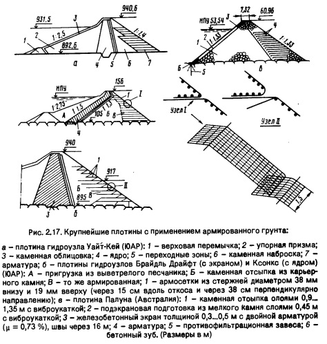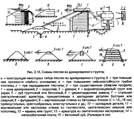 Их достоинства: технологичность; сокращение сроков строительства, так как существенно уменьшается объем тела плотины; на 10...20 % ниже стоимость; короче трубчатые водопропускные сооружения в зоне плотины; повышенная сейсмостойкость. Недостатки: некоторое усложнение производства работ; наличие арматуры. Армирование грунта применяют в плотинах: для обеспечения устойчивости более крутых верховых и низовых откосов и снижения объема насыпи; для пропуска строительных расходов через недостроенную плотину при армированном низовом откосе, при этом к анкерам крепят мелкую сварную сетку (плотины Сетана и Орд, Австралия) или геотекстильные материалы; для одновременного обеспечения вышеуказанного. Плотины из армированного грунта возводят из различных грунтов: песчаных, песчано-гравелистых, гравелистых, каменных. Начали применять и глинистые грунты. В качестве арматуры используют металлические полосы из стали (оцинкованной, нержавеющей или с эпоксидным покрытием), а также геотекстиль. Наиболее эффективны плотины из армированного грунта при устройстве поверхностного водослива на гребне (см. рис. 2.16, а,