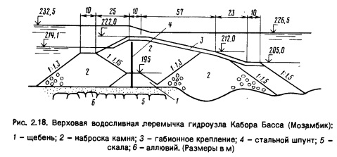 Достоинства: не требуется отдельный водосброс, можно пропускать пиковую часть строительного расхода с переливом через плотину. Для высоких каменно-насыпных плотин с железобетонными экранами, имеющих малые осадки, проработаны конструкции автоматических водосбросов-быстротоков [с удельными расходами до 25... 30 м3/(с • м) при паводках продолжительностью до 2...4 нед], располагаемых на низовом откосе крутизной 1:1,4-1:1,5. Чтобы уменьшить осадки под ними, отсыпают мелкий камень или гравий и укатывают виброкатком как подэкрановую насыпь. Арматуру пропускают через швы лотка. Лоток также заанкеривают в каменную насыпь. Эти водосбросы могут работать постоянно или редко (при пропуске катастрофических расходов). Применяют и водосливные перемычки (при затоплении котлована и пропуске значительных паводков), это позволяет уменьшить сечение туннелей. Низовой откос перемычки укрепляют габионами (перемычки плотины Кабора Басса, Мозамбик, см. рис. 2.18) и железобетонными плитами (перемычка Токтогульской плотины, Кыргызстан). |