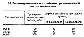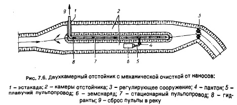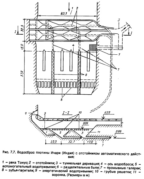 7.1. Рекомендуемая ширина отстойников при механической очистке землесосами На рисунке 7.6 показан двухкамерный отстойник с механической очисткой и сбросом пульпы на один берег. Примерно такого типа отстойник с незначительной криволинейностью запроектирован на Канширском магистральном канале расходом до 175 м3/с, служащим для орошения земель площадью до 350 тыс. га. Средняя мутность воды 3,26 кг/м3, достигающая в отдельные периоды 13...15 кг/м3. Наносы в большей части мелкопесчаные с содержанием свыше 50 % фракций диаметром 0,05...0,01 мм. Для борьбы с попаданием крупных наносов в деривационный канал на индийском гидроузле Ичари предусмотрен отстойник автоматического действия, встроенный в бетонную плотину высотой 60 м (рис. 7.7). При его ревизии через 9 лет выяснилось, что сорвана сороудерживаю- щал решетка водоприемника, которую нашли в одной из камер отстойника. Другая камера оказалась забитой наносами и древесным материалом. В основном сооружение работает удовлетворительно, улавливая 85 % частиц размером более 0,06 мм. В деривационный канал попадают наносы мельче 0,5 мм.