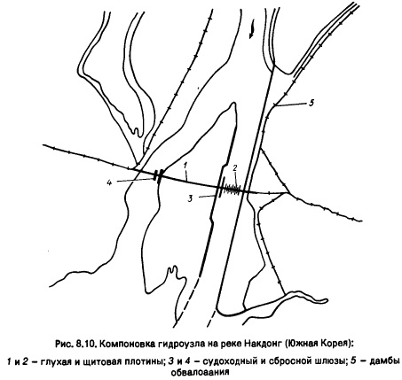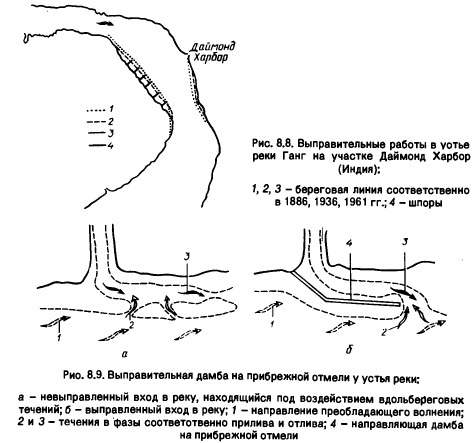 Примером регулирования эустариев могут служить работы, выполненные в устье реки Ганг (рис. 8.8). Необходимость их проведения была вызвана значительными деформациями берега на участке длиной 9 км и обмелением русла. С учетом характера руслового процесса и результатов модельных исследований были рекомендованы устройство шпор длиной около 600 м каждая и расчистка русла земснарядами. Уменьшить поступление наносов в устье эстуария можно путем устройства направляющей дамбы на прибрежной отмели (рис. 8.9) [24]. Для предотвращения поступления морской воды в эстуарий построены гидроузлы на реках Накдонг (Южная Корея), Фени (Бангладеш). Имеются проектные проработки, например, на реке Лимпопо (Мозамбик). В эстуарии реки Накдонг гидротехнический комплекс (рис. 8.10) включает в себя бетонную плотину, оборудованную сегментными затворами, судоходный и сбросный шлюзы, грунтовую плотину. Общая длина водоподпорного фронта составляет 2,4 км. Ввиду сложности процессов, происходящих в эстуариях, мероприятия по регулированию должны разрабатываться с учетом всех действующих факторов, проверяться в лабораторных условиях и на математических моделях. |