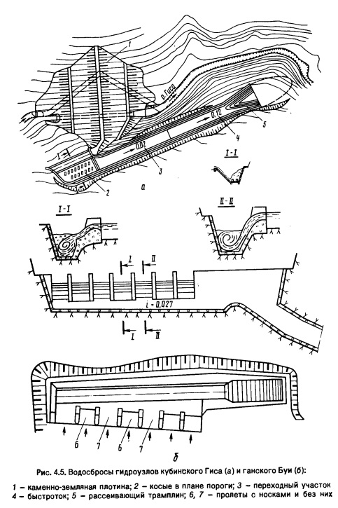 ОТКРЫТЫЕ БЕРЕГОВЫЕ ТРАНШЕЙНЫЕ ВОДОСБРОСЫТраншейные водосбросы в странах с жарким климатом устраивают обычно в тех случаях, когда гидроузел возводят в узком каньоне с крутыми бортами. Береговой водосброс с фронтальным входом в этих условиях осуществить трудно из-за необходимости выполнения глубо-ких и весьма больших по объему выемок горной породы. Примерами строительства достаточно крупных траншейных водосбросов могут служить кубинские гидроузлы: Алакранец - 2400 м3/с, Хилберт (Дос Пальмас) - 1850 м3/с, Сабанилья - 2000 м3/с, Гиса - 1200м3/с (рис. 4.5, а). Один из крупнейших гидроузлов с траншейным водосбросом - американский гидроузел Гувер (Боулдер) с бетонной плотиной. Он имеет два траншейных водосброса на суммарный расход 5663 м3/с. Характерные особенности этого гидроузла - значительный напор (222 м) и выполнение проточной части в виде наклонного туннеля. Основная проблема создания благоприятных гидравлических условий работы траншейных водосбросов - правильное назначение размеров и очертаний траншеи. Так, на водосбросе гидроузла Гиса для обеспечения эффективного гашения избыточной энергии потока, эвакуации расходов и улучшения условий протекания потока в пределах траншеи устроены косые спаренные донные пороги и специально подобраны очертания левосторонней стенки, сопрягающей траншею с быстротоком. Для этих целей применяют также удлиненные криволинейные в плане бычки или чередующиеся через один пролет носки. Последнее решение специально разработано для траншейного водосброса гидроузла Буи в Гане (рис. 4.5, б). Оно позволило, как и в случае с гидроузлом Гисой, уменьшить циркуляцию потока в траншее и улучшить условия течения в ее пределах. На ряде кубинских гидроузлов также применяли специальные гасители, устанавливаемые на стенке траншеи, противоположной водосливу. В проектной практике применяют также различную форму траншей в плане.