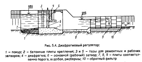 Входная часть (верхний участок) открытого регулятора может быть в виде обратной стенки, ныряющей стенки, косой плоскости, обратной стенки с сужением. При распределении воды по нескольким каналам делают узлы регуляторов, в которых одно перегораживающее сооружение обслуживает несколько водовыпусков, расположенных в узле (рис. 5.3). Однако может быть и другая схема расположения сооружений, когда одно перегораживающее сооружение обслуживает несколько водовыпусков, размещенных перед ним по длине канала. Крупные сооружения проектируют, как правило, многопролетными, обычно коробчатыми (доковый тип) без разрезки по флютбету. При значительных колебаниях расходов и уровней воды перед сооружением на входе открытого регулятора устанавливают железобетонную диафрагму (забральную стенку), что позволяет существенно уменьшить высоту затворов, упростить их конструкцию и облегчить маневрирование ими. Такие регуляторы называют диафрагмовыми (рис. 5.4) и применяют в водозаборных сооружениях, в каналах, располагаемых в глубоких выемках при малых уровнях нижнего бьефа. В качестве водоподпорного сооружения на хозяйственном или межхозяйственном оросительном канале с расходом от 0,2 до 0,85 м3/с можно использовать открытый однопролетный регулятор. Его отверстие перекрывается металлическим затвором с ручным приводом. Расчет пропускной способности открытого регулятора проводится как для водослива с широким порогом. При работе двухпролетного регулятора одним отверстием картина истечения более сложная. Расчет и конструирование таких водобойных частей при сбойном течении можно найти в работе [13].
