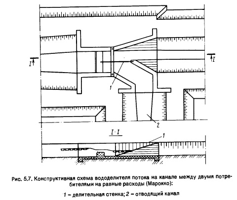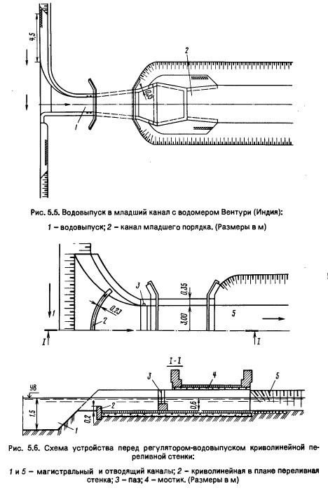 В практике мелиоративного строительства применяют водовыпуски из магистральных каналов в каналы межхозяйственные, и особенно водовыпуски в хозяйственные каналы или лотки. Их входные участки оборудуют водомерами. Так, в Индии распространены водомеры Вентури (рис. 5.5). Иногда здесь вместо водомера Вентури на входе в младший канал устанавливают для тех же целей прямоугольный лоток. При отводе воды в младший канал необходимо предотвращать поступление донных наносов, ухудшающих работу всей оросительной сети. С этой целью отметки порога регулятора-водовыпуска делают выше отметок дна главного канала (рис. 5.6)._ Однако с течением времени вследствие отложения наносов дно главного канала постепенно поднимется, и наступит такой момент, когда донные наносы начнут беспрепятственно поступать в регулятор-водовыпуск. В связи с этим проводят и другие мероприятия, предотвращающие поступление донных наносов в боковые отводы канала: устраивают системы донных струенаправляющих стенок в канале перед регулятором-водовыпуском, отклоняющих донные токи, содержащие наносы, к противоположному водозабору берегу; возводят короткую криволинейную шпору в сочетании со струенаправляющими донными стенками; устраивают донную промывную галерею высотой 0,5 м перед регулятором-водовыпуском в сочетании с криволинейной шпорой; устанавливают криволинейные в плане щиты, направляющие поверхностные токи к отверстиям регулято-ра; устраивают донную наносоперехватывающую галерею в пороге водозаборного устройства; используют криволинейный в плане порог- тонкую стенку переменной высоты перед входом в аванкамеру водо- выпуска (см. рис. 5.6); применяют метод искусственной поперечной циркуляции, предотвращающий поступление донных наносов в боковой регулятор-водовыпуск; перед входом в регулятор располагают плавучую струенаправляющую систему, отклоняющую донные токи с донными наносами к противоположному от регулятора берегу.