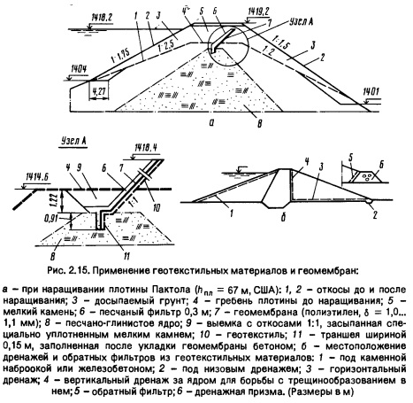 Геотекстиль и геомембраны можно использовать и при наращивании плотин в сочетании с полимерными пленками (рис. 2.15,а). |