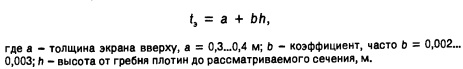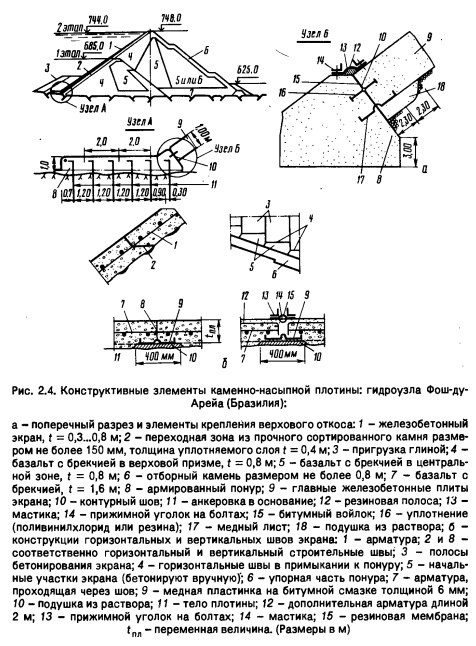 Контурный шов - важный элемент, отделяющий экран от понура, имеет часто три уплотнения (см. рис. 2.4 и 2.5): нижнее - медная пластинка с компенсатором; среднее - резиновая или поливинилхлоридная лента; верхнее - упругая мастика, защищенная от повреждений резиновой лентой. Для защиты от повреждений при поворотах экрана в шов укладывают битумный мат толщиной 12 мм или доски. В некоторых плотинах понур и контурный шов засыпают уплотненным глинистым грунтом, который при повреждении контурного шва за счет кольмата- ции создает необходимую водонепроницаемость. Горизонтальные швы - это обычно рабочие швы, образующиеся при непредвиденных остановках скользящей опалубки (см. рис. 2.4). Их устраивают на плотинах (см. рис. 2.5) и в нижней части экрана, где для установки скользящей опалубки вручную бетонируют начальные участки полос экрана. В экранах многих плотин эти швы отсутствуют. Плита-понур - специфичный элемент конструкции (см. рис. 2.4 и 2.5) для сопряжения экрана с основанием. Перед ее укладкой снимают выветрелую часть скалы. На прочной скале толщина плиты f = 0,05Н, на менее прочной t = 0,1 Н; fmln >3м. Для плиты-понура не требуется зуб, как в старых конструкциях каменно-набросных плотин, поэтому исключается разработка скалы под него. При устройстве противофильтраци- онной завесы с поверхности заанкеренной плиты она играет роль пригрузки. При необходимости под плитой выполняют укрепительную цементацию. Подэкрановая зона представляет собой обычно одно-двух- слойную подготовку из относительно мелкого камня (см. рис. 2.4 и 2.5), крупность которого возрастает в направлении к нижнему бьефу. Ширина каждого слоя подготовки 3...6 м для проезда строительных машин. Толщина слоя отсыпки 0,4...0,6 м. Предельная крупность камня при двухслойной подэкрановой подготовке в зоне 2 (см. рис. 2.4, а) 0,22 и 0,4 м при особо тщательном уплотнении. Для уменьшения возможной фильтрации при протечках экрана в переходную зону начали укладывать материал с содержанием песка 35...55 %. Материал подбирают по типу обратного фильтра. Уплотненную и спрофилированную поверхность для защиты от эрозии и повреждений покрывают слоем набрызг-бетона или битума. Тело плотины занимает обычно основную часть профиля, толщина слоев здесь 1,0...2,0 м; предельная крупность камня 0,6...1,0 м. Содержание мелких фракций крупностью менее 5 мм не должно превышать в горной массе 35...40 %. Иногда укладывают такими же слоями и последующую зону - пригрузку из особо крупного камня (размером не менее 1,35 м) с малым уплотнением или без него. Часто для этого используют горную массу из полезных выемок. Для сверхвысоких (порядка 120...300 м) каменно-насыпных плотин предлагается применять полуводопроницаемую подэкрановую зону шириной 5...10 м из сортированного мелкого щебня или гравия с небольшим количеством цементного раствора (как, например, на плотинах: Сирата,hnn = 125 м, Индонезия; Шингу, hn - 140 м, Бразилия). За подэкрановой зоной иногда устраивают наклонный дренаж толщиной 4...8 м из крупного гравия (см. рис. 2.5, а), переходящий в горизонтальный. Он отводит воду, профильтровавшуюся из образовавшихся по каким-либо причинам трещин в экране. Для снижения порового давления при ливневых дождях в низовой призме устраивают дренажные полосы шириной 4...8 м с фракциями размером 12...75 мм (плотина Якамбу, hn = 162,5 м, Венесуэла). Различные части плотины уплотняют за 4...6 проход