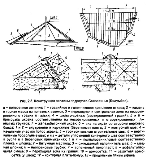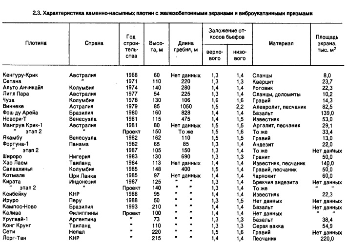 ПРОТИВОФИЛЬТРАЦИОННЫЕ ЭЛЕМЕНТЫ ИЗ НЕГРУНТОВЫХ МАТЕРИАЛОВКаменно-насыпные плотины с однослойными железобетонными экранами и виброукатанными призмами. В странах с жарким и тропическим климатом, как и в ряде других, начали проектировать и строить каменно-насыпные плотины с однослойными железобетонными экранами (табл. 2.3). В отличие от каменно-набросных плотин (их уже практически не делают), для которых камень сбрасывали с эстакад высотой 10...60 м, а затем уплотняли струей гидромонитора, в каменно-насыпных камень укладывают слоями толщиной f = 0,8...1,5 м (даже до 2... 3 м). Размер максимальной фракции камня не менее 0,75f. Насыпь уплотняют пневмокатками массой 30...70 т за 6...8 проходок или виброкатками массой 10...15 т за 2...6 проходок. При послойной отсыпке повышаются прочностные свойства насыпи, уменьшаются ее деформации, то есть возможно обжатие профиля плотины.