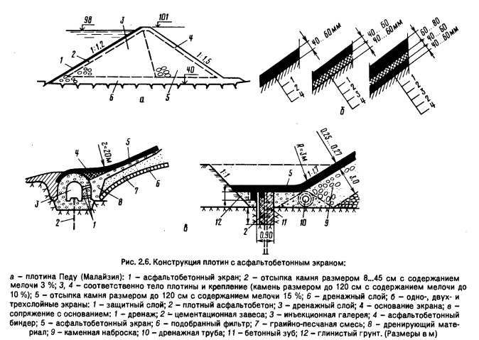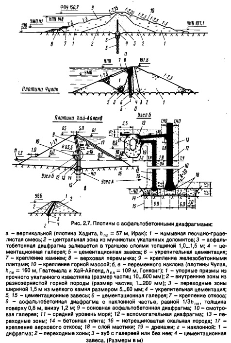 Асфальтобетон укладывают в горячем состоянии и уплотняют. Его состав: плотного - битум 7...11 %, наполнитель (доломитовый или известняковый порошок 15...25 %), заполнитель (песок 50...80 % и щебень 10...25 %); пористого - битум 3...5 %, наполнитель 0...5 %, песок 15...25 % и щебень 40...65 %. Для защиты от ультрафиолетовых лучей всегда выполняют окраску горячей или холодной асфальтовой мастикой, устраняющей также мелкие неплотности экрана, иногда укладывают бетон белого цвета, и от тепловых воздействий при опасности сползания экрана - светоотражающую окраску. Часто применяемое сопряжение экрана с основанием показано на рисунке 2.6, в. Подготовка под экран представляет собой дренажный слой (щебень, гравий), при земляных откосах иногда из протравленного гербицидами грунта. Если плотина выполнена из каменной наброски, то на последнюю отсыпают камень крупностью 50...150 мм слоем толщиной 10... 50 см, а затем укладывают подготовку из тощего бетона или асфальтовый биндер крупностью 0...18 мм. Коэффициент заложения верхового откоса принимают 1,7...1,8 до 2, исходя из устойчивости экрана и удобства производства работ. Асфальтобетонные экраны выполняют специальными асфальтобетоноукладчи- ками. Высота таких плотин ограничивается пока особенностями технологии. Достоинства асфальтобетонных экранов: надежность и долговечность; простота управления свойствами за счет состава наполнителя и заполнителей;; водостойкость и водонепроницаемость, кф А • (10-7... 10-9 до 10-12) см/с; высокая деформативность; простота производства работ и ремонта; способность играть роль крепления. Недостатки: ограничение высоты плотины примерно до 150 м, что связано с работой асфальтоукладчиков на откосе; потребность в камне плотных горцых пород и его виброукатке для плотин высотой 50...100 м; увеличение продолжительности строительства, так как экран укладывают лишь после устройства насыпи плотины; возможность промерзания экрана при низких температурах в горах (плотный асфальтобетон укладывают при температуре воздуха не менее 5 °С). Асфальтобетонные диафрагмы выполняют из плотных (уплотняемых) или из литых асфальтобетонов. Первые имеют минимальное количество битума, поэтому они более жесткие. Их тщательное уплотнение для обеспечения водонепроницаемости достигается лишь при сухой погоде и температуре воздуха не менее 5 °С специальными асфальтоукладчиками. Вторые отличаются повышенной деформатив- ностью, самоуплотняются, восстанавливают при разрушении свою прочность, можно возводить при атмосферных осадках и при низких температурах (в горах). При использовании литых бетонов камень в диафрагму часто укладывают или погружают вибрированием.