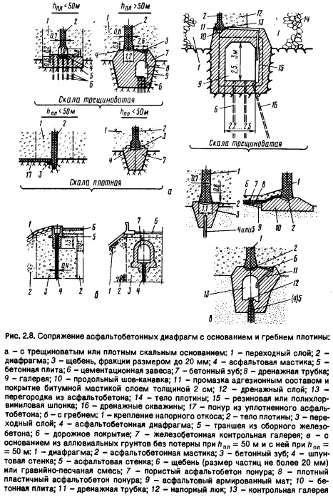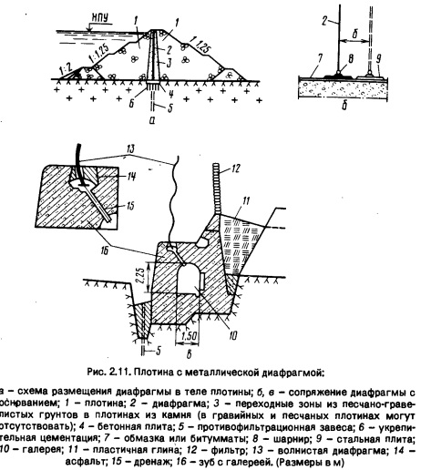 Сопряжение со скальным основанием осуществляют цементацией скалы, часто из галереи; по контакту диафрагма-скала устраивают сопрягающую площадную цементацию. При аллювиальном основании: небольшой мощности - инъекционную диафрагму сопрягают с коренными породами цементацией аллювия или траншейной стенкой, зубом; большой мощности - иногда продолжением инъекционной диафрагмы в основании служит инъекционная завеса, выполненная из галереи цементно-глинистыми или химическими растворами. Инъекционные диафрагмы устраивают как при возведении плотины насухо, так и при отсыпке грунта в стоячую или текущую воду без перемычек. При наполнении водохранилища одновременно с возведением плотины через нее начинается фильтрация; инъекционные работы выполняют при скоростях фильтрации до 250.. .300 м/сут.