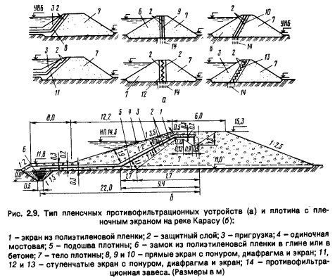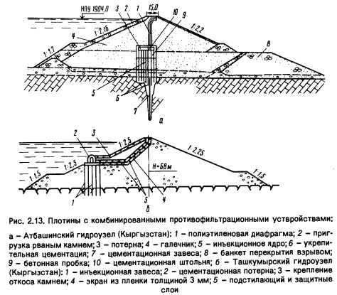 Инъекционные диафрагмы ускоряют сроки строительства, их можно создавать при влажном и дождливом климате (и суровом - в горах), где трудно возводить ядро из грунтовых материалов, при отсутствии для ядер и экранов глинистых материалов, для ремонтных работ. Недостаток - возможность появления трещин при деформациях низовой призмы. Инъекционные диафрагмы применены на части Атбашинс- кой плотины (рис. 2.13), в перемычке Токтогульского гидроузла (Кыргызстан). Плотины с комбинированными противофильтрационными устройствами. Пример такого решения (инъекционная диафрагма + пленочная диафрагма) - Атбашинская плотина (hn = 79 м, Кыргызстан, рис. 2.13,а), построенная в узком ущелье отсыпкой аллювия в воду. Слой аллювия в основании толщиной 10 м и скальное основание зацементированы из продольной галереи при одновременном устройстве инъекционной диафрагмы (семь рядов скважин, шаг 3,5 м) толщиной 26 м из цементно-бентонитовых, бентонитовых и алюминатно-силйкатных растворов при допускаемом градиенте 2,5...2,8. Выше располагается диафрагма из полиэтиленовой пленки высотой 36,5 м, толщиной 0,6 мм. С обеих сторон расположены защитные полиэтиленовые полосы толщиной 0,6 мм и песчаные слои (крупностью частиц до 5 мм). В качестве варианта для грунтовой плотины Ташкумырского гидроузла (hnJ1 = 68 м, Кыргызстан, рис. 2,13, б) разработано комбинированное противофильтрационное устройство с инъекционной завесой и пленочным экраном. Для высоких плотин такое решение позволяет уменьшить технологические трудности и проще обеспечить устойчивость пленочного экрана на крутых откосах по сравнению с железобетонным и асфальтобетонным, в которых могут также в нижней части возникать большие сжимающие напряжения. Некоторые другие типы противофильтрационных элементов. На ряде плотин в странах с жарким климатом в качестве противофильтрационных элементов применены диафрагмы и экраны из грунтоцемента, которые достаточно хорошо показали себя в эксплуатации.