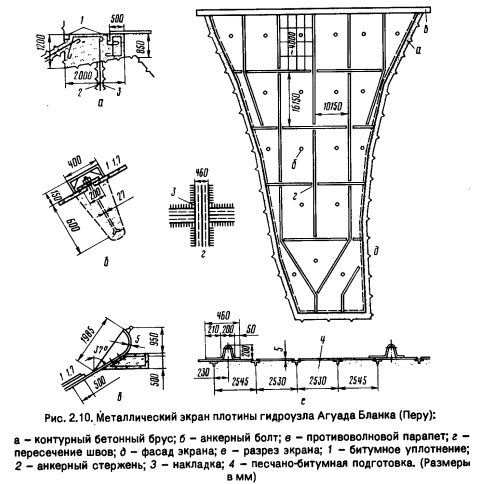 Экраны из полимеров применяют по СНиП 2.06.05-84 для плотин III и IV классов, а при обосновании - I и II классов высотой до 60 м. Срок службы с учетом старения материала принимают равным 50...60 лет. Их достоинства: высокая водонепроницаемость, фильтрационные потери не более 2 %; эластичность; достаточная прочность; высокая технологичность при сравнительно низкой стоимости (в 2,0..2,5 раза ниже стоимости асфальтобетона, кроме полиэтилена); устойчивость против коррозии и химическая стойкость при агрессивных водах, что особенно важно для накопителей-отстойников промышленных предприятий, ТЭС и АЭС; легко свариваются и склеиваются, наклеиваются на бетон (кроме полиэтилена). Недостаток - возможность старения и ограничение по долговечности. Грунтовые плотины с металлическими экранами и диафрагмами. Такие плотины применяют в различных климатических зонах. В мире построено 37 плотин с экранами и 19 с диафрагмами. Особый интерес они представляют при отсутствии грунтовых материалов для противо- фильтрационных устройств, при длительном дождевом периоде, в удаленных горных районах. Экраны делают обычно из листовой стали, иногда с примесью меди, что повышает антикоррозийные свойства (8...10 мм). Толщина зависит от антикоррозийности металла, применяемых покрытий, от условий сработки водохранилища. Листы экрана соединяют монтажными болтами, затем сваривают, приваривают компенсаторы через 7...10 м, а при крутых откосах - также ребра жесткости. Многолетний опыт эксплуатации показал, что затруднений в их эксплуатации не возникает. В плотинах из камня экран иногда делают на песчаной, песчано-битумной или асфальтобетонной подготовке, уложенной на переходную зону толщиной 5...6 м, предназначенную для предупреждения неравномерных деформаций откоса. На рисунке 2.10 приведена конструкция экрана плотины Агуада Бланка (hn=80 м, Перу). Он окрашен свинцово-цинковой краской в два слоя с верховой стороны и в один слой с низовой. Экран приварен к тавровым балкам (клетки 2,5 х 4 м), температурные швы делят его на карты (10 х 16 м). К контурному бетонному зубу экран приваривали в последнюю очередь.