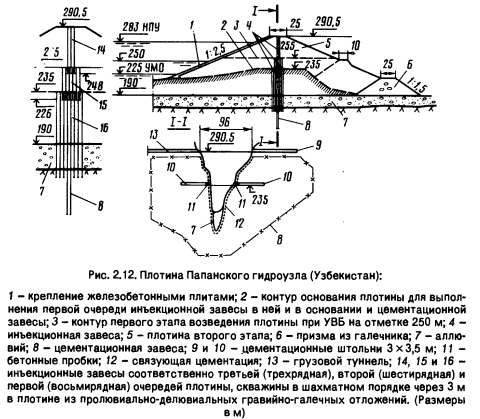 Диафрагмы выполняют обычно из стали толщиной 8...16 мм, иногда из шпунта. Как правило, они имеют вертикальные деформационные швы в виде компенсаторов через 30...40 м, а иногда и горизонтальные (для высоких плотин, то есть при больших осадках). Сопряжение диафрагм с основанием показано на рисунке 2.11, а с водопропускными сооружениями осуществляют заделкой в бетон. Срок службы диафрагм без антикоррозийного покрытия 50...100 лет, а с виниловой, эпоксидной, битумной или асфальтовой защитой - до 500 лет. Достоинства металлических экранов и диафрагм: высокая скорость монтажа; гибкость; сейсмостойкость; водонепроницаемость. Недостатки: необходимость антикоррозийной защиты, причем опасна не равномерная коррозия (0,01...0,05 мм/год), а язвенная (0,1...0,4 мм/год); достаточно высокая стоимость. Плотины с инъекционными диафрагмами. Они достаточно перспективны. Их можно применять в земляных плотинах, лучше всего из гравийно-песчаных грунтов (например, Папанская, h = 100 м, Узбекистан, рис. 2.12). При гравийных и гравийно-галечных грунтах возникают сложности, связанные со значительным растеканием раствора и бурением. Инъекционная диафрагма создается нагнетанием в поры грунта плотины раствора через скважины с шагом 1,2...1,5 м (иногда до 3 м), при необходимости расположенных в несколько рядов. Инъекти- рование ведется снизу вверх. При кф > 0,1 см/с применяют глиноцементный раствор, при кф < 0,1 см/с - глиносиликатные, алюминатно- силикатные, полимерные и глинополимерные растворы. Толщина диафрагмы в основании напор на плотину. Толщину проверяют на условие фильтрационной прочности: