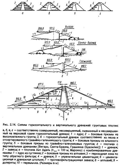 Для диафрагм используют и укатанный бетон (плотина Шимен, h = 55 м, толщина 3 м, Тайвань), при этом достигают высоких темпов строительства. Для сверхвысоких (120...300 м) каменно-насыпных плотин предлагается выполнять полуводопроницаемую подэкрановую кладку шириной 5...10 м из сортированного мелкого щебня или гравия (плотины Сирата, бпл = 125 м, Индонезия; Шингу, hnn = 140 м, Бразилия). При небольшом увеличении стоимости существенно сокращается фильтрация и становится неопасной даже при разрыве шпонок в швах экрана. Дренаж. Горизонтальный и вертикальный дренаж находит широкое применение в странах с жарким и тропическим климатом. Назначение горизонтального дренажа - уменьшение порового давления и ускорение консолидации в маловодопроницаемых грунтах; повышение устойчивости верхового откоса при быстром снижении уровня воды в верхнем бьефе; снятие или уменьшение динамического порового давления при землетрясении; уменьшение порового давления в переувлажненных грунтах. Некоторые принципиальные схемы горизонтального дренажа приведены на рисунке 2.14, а...г; возможны и иные схемы, отличающиеся отсутствием противофильтрационного элемента, дренированием только верховой или низовой призмы (плотины Тава, h„„ = 36,6 м; Тенугат, hn = 50,6 м, Индия). Дренаж может называться совершенным, если он доходит до границы ядра (рис. 2.14, а), несовершенным (рис. 2.14, б) или смешанным (рис. 2.14, в). Для первого применяют песок или его смесь с гравием; толщина слоя 0,15...0,6 м через 2...6 м по высоте. Если водохранилище срабатывается быстро, или тело плотины сложено из укатанных гравийно-галечниковых грунтов, то дренаж выполняют из сортированных гравийно-галечниковых грунтов; толщина слоя 0,6...1,8 м, расстояние между ярусами 4...16 м. Вертикальный или слабонаклонный дренаж в низовой призме (рис. 2.14, б) устраивают в плотинах из глинистых грунтов (рекомендуется влажность на 2...3 % ниже оптимальной). Такой дренаж - средство от суффозии при возникновении вертикальных трещин. При его устройстве в траншею шириной % 1 м засыпают ступенями (0.3...1 м) фильтровый материал, укатываемый виброкатками до плотности, равной 0,7 максимальной. Возможно и сочетание вертикального и горизонтального (или наклонного) дренажа; при выполнении ядра наклонный дренаж часто соединяют с горизонтальным, отсыпанным в низовой призме при наличии аллювия (рис. 2.14,е) на границе с ним, для предотвращения суффозии. |