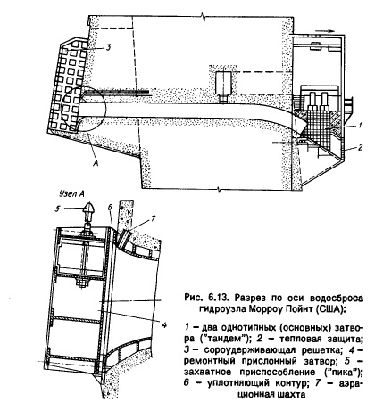 СОВРЕМЕННЫЕ ТЕНДЕНЦИИ ПРОЕКТИРОВАНИЯ И ПРОБЛЕМЫ ЭКСПЛУАТАЦИИ ЗАТВОРОВПо данным Французского Национального комитета по большим плотинам, наиболее рациональны комбинированные водосбросы, оборудованные поверхностными и глубинными затворами, так как они позволяют не только повысить надежность, но и в полной мере использовать преимущества как поверхностных, так и глубинных водосбросов. Примером такой компоновки могут служить гидроузлы Монтейнар (Франция), Кабора Басса (Мозамбик), Эль Кахон (Гондурас), Мухдиг (Саудовская Аравия) и др. В зависимости от конкретных условий глубинные водосбросы можно располагать одним, двумя и более ярусами. Повысить их надежность позволяет возможность регулирования потока аварийно-ремонтными затворами при отказе основного регулирующего затвора (например, гидроузлы Каунертал - Австралия, Сент Круа - Франция и др.). Причем на некоторых гидроузлах (например, Морроу Пойнт - США), кроме двух регулирующих затворов, расположенных с низовои стороны, на входе в водовод устанавливают еще дополнительный ремонтный затвор (рис. 6.13). Основные тенденции американского затворостроения - стремление к простоте, максимальной типизации оборудования. Конструкции затворов гидроузлов европейского региона отличаются большей сложностью и многочисленностью типов [25, 48], что объясняется повышенными требованиями к регулированию к»к уровней в бьефах, так и сбросных расходов, к охране окружающей среды. Японские гидростроители уделяют больше внимания повышению таких эксплуатационных качеств, как доступность осмотра и ремонта всех ответственных узлов затвора, закладных частей и механизмов. При использовании крупных высоконапорных затворов в первую очередь надо устранять вибрацию и кавитацию. Основные источники вибрации - пульсация гидродинамического давления, обусловленная турбулентностью потока, неправильно выбранными формами водоционная шахта пазов или нижней кромки затвора, переходными режимами. Кроме того, источниками вибрации могут быть протечки воды через уплотнения затворов [4, 33], недостаточная жесткость конструкции затвора или отдельных его частей, неправильно выбранное место подвода воздуха или количество подводимого воздуха, недостаточный коэффициент посадки затвора на порог. При больших скоростях потока часто возникает кавитация, которая может привести к кавитационной эрозии и вибрации затвора, а иногда и всего сооружения.