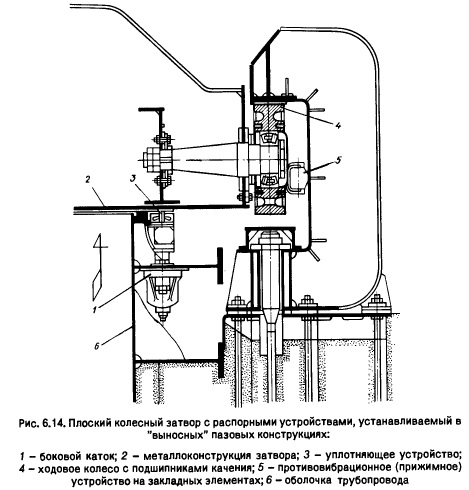 Аварии с затвором могут быть вследствие нарушения персоналом правил эксплуатации или непредвиденных отказов в работе механизмов, гидравлической или электрической системы. При этом наиболее опасны и вероятны отказы, возникающие при подъеме затворов (например, в период нарастания паводковых расходов) [25]. Осложнения в эксплуатации затворов в ряде случаев были вызваны наносами, влекомыми потоком воды и отложившимися в камерах, нишах, в водохранилищах. Они создали трудности при открывании нижнего плоского затвора водопроводящего тракта ГЭС гидроузла Гриб (Алжир). Взвешенные наносы усиливают абразивное изнашивание обтекаемых участков затворов, в том числе и деталей их уплотнений. Особенно снижает долговечность уплотнений плавающая древесина и топляк. Известен случай [4], когда в результате нарушения синхронного подъема верхней секции сдвоенного сегментного затвора, перекры-вающего пролет длиной 20 м, возник перекос (около 250 мм), который не только нарушил работу боковых уплотнений, но и разрушил ноги секции. Опорные части верхней секции, выполненные в виде обычного цилиндрического шарнира, не могли устранить такой перекос. При высоких напорах чрезвычайно усложняются условия работы уплотнений затворов. Пульсация давлений вызывает колебание уплотняющего элемента с тенденцией к самовозбуждению при увеличении щели. Одновременно с вибрацией уплотнений возникает вибрация затвора. Часто колебательные процессы в уплотнениях переходят в автоколебания, для которых характерны периодичность и значительные амплитуды. Они могут вызвать недопустимые динамические напряжения в элементах затвора и, прежде всего, в самих уплотнениях, а следовательно, и усталостные разрушения швов, болтов. Работа высоконапорного затвора при частичном открытии без вибрации в большой степени зависит от того, насколько плотно и с какой силой будут прижаты уплотнения. Уплотняющие элементы подвергаются как фрикционному, так и коррозионному и кавитационному изнашиванию, а резина и пластмассы - старению. В условиях субтропического и тропического климата активно протекающие процессы коррозии и старения материалов представляют существенную опасность для уплотнений затвора. Весьма распространены кавитационные повреждения пазов затворов и околозатворных участков, особенно опасных в напорных водосбросах. Поэтому необходимо принимать меры к их недопущению [38, 39]. Опыт эксплуатации донных водовыпусков зарубежных гидроузлов показал оправданность установки на донных водовыпусках последовательно двух затворов независимого действия и доступных для эксплуатационного обслуживания без спуска водохранилищ. Чтобы не допускать вибрацию высоконапорных регулирующих затворов и затворных камер, необходимо принимать такие очертания водоводов, пазов, кромок затворов, которые будут плавно формировать поток; использовать специальные прижимные устройства, удерживающие затворы в любом промежуточном положении (рис. 6.14); устраивать два ряда уплотнений, исключающих протечки, опирание затворов на порог без резиновой полосы. Особое внимание надо уделять борьбе с коррозией оборудования и его частей, недоступных или труднодоступных для осмотров и эксплуатационного обслуживания (например, пазы и направляющие верховых ремонтно-аварийных затворов, облицовки и кон