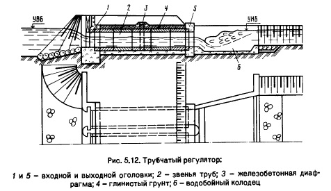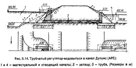 Трубы используют круглые, диаметром до 1,4...1,6м или прямоугольные в многоочковых регуляторах, размерами 1,5х2,0...2,0х2,5 м. При больших поперечных размерах принимают конструкции коробчатого докового типа, то есть жесткую конструкцию, в которой в единое целое соединены донная плита (флютбет), устои, быки, пролетное строение. Трубы могут быть безнапорными и напорными, их гидравлические расчеты приведены в работе [13]. При напорных трубах следует предусматривать мероприятия, исключающие или смягчающие неблагоприятные переходные режимы в трубе (от безнапорного к напорному и обратно). Основной тип крепления нижнего бьефа - устройство в конце водобойной части щелевой водобойной стенки, обеспечивающей и гашение энергии гидравлического прыжка, и промывку наносов из нижнего бьефа, и опорожнение нижнего бьефа при отключении регулятора. В необлицованных каналах в конце рисбермы может быть зуб, а в облицованных - рисберма, переходящая в облицовку. В многопролетных регуляторах при несимметричном выпуске воды проблема борьбы со сбойным течением решается на основе данных исследований [13]. Сооружения на мелиоративной сети чувствительны к деформациям, связанным с просадками и набуханием лёссовых грунтов. Поэтому на сильнопросадочных грунтах или проводят повторный монтаж сборных сооружений для постоянной эксплуатации после завершения просадок и связанных с ними деформаций, или возводят на период замачивания временные инвентарные сооружения.