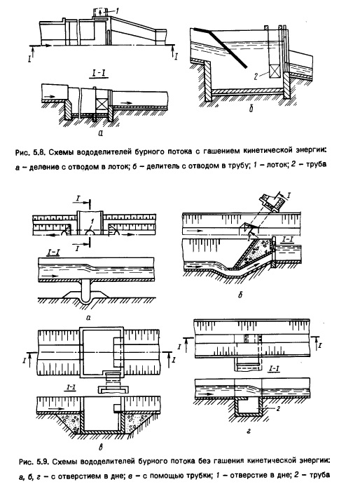 Принципиальные схемы планового деления бурных потоков (рис. 5.10) определяются условиями сопряжения отводимого и транзитного потоков. Параметры их принимают на основе гидравлических исследований и специальных расчетов. Пример одного из делителей с делением потока в вертикальной плоскости представлен на рисунке 5.11. |