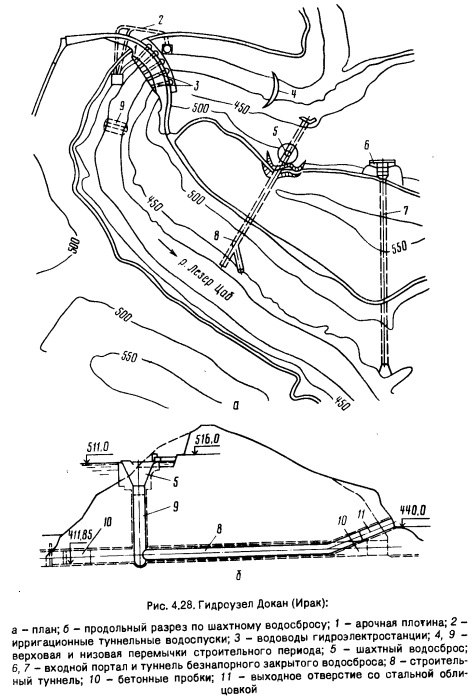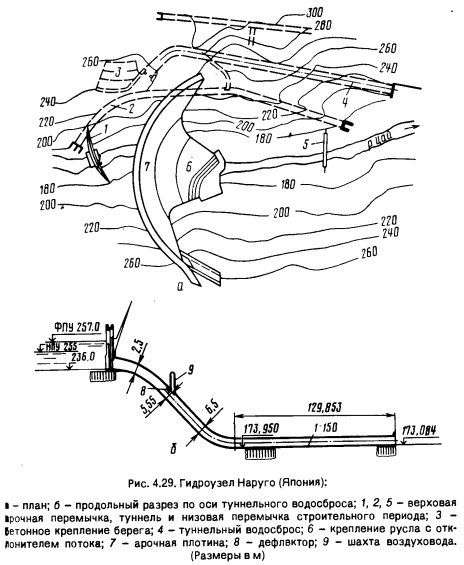 Примечание. Б - безнапорный водосброс с лобовым подводом воды; Ш, Г - шахтный и глубинный водосбросы. В состав компоновки гидроузла Наруго входит и открытый водосброс с поверхностным переливом через плотину гравитационный устой; приплотинную ГЭС мощностью 137 МВт; левобережный водосброс, рассчитанный на пропуск расхода 4000 м3/с, два правобережных донных водосброса на расход 150 м3/с. Строительные расходы пропускали временным туннельным водосбросом размером 12,2x9,5 м с расчетным расходом около 2000 м3/с. В гидроузлах с арочными и арочно-гравитационными плотинами часто применяют и туннельные водосбросы (табл. 4.11). При этом получают ряд существенных преимуществ, основные из которых следующие: в достаточно стесненных створах облегчаются условия размещения и последующей эксплуатации гидроэлектростанции; улучшаются условия производства строительных работ, обеспечивается их широкий фронт; благодаря устранению прорезей и отверстий в плотине достигается наилучшее распределение напряжений в ее теле. Однако туннельные водосбросы по своей стоимости могут быть существенно дороже открытых водосбросов. Поэтому при их выборе необходимо проводить технико-экономическое сравнение. Выше уже приводились примеры, когда туннельные водосбросы использовали в составе компоновок гидроузлов с арочными плотинами в качестве временных водосбросов строительного периода. Известны случаи, когда в силу сложившихся обстоятельств эти же водосбросы оставляли в качестве постоянных или резервных эксплуатационных водосбросов, работающих в паре с другим постоянным водосбросом. В странах с мягким или жарким климатом эти водосбросы можно сразу возводить как постоянные. Их подразделяют на три основных типа: безнапорные с поверхностным водоприемником, наклонной соединительной шахтой и горизонтальным отводящим туннелем; шахтные с напорной шахтой и чаще всего безнапорным отводящим туннелем; напорные и безнапорные с глубинным входным оголовком. Примерами использования водосбросов первого типа служат гидроузлы Навагадо и Кабрил (рис. 4.27). Иракский гидроузел Докан - пример строительства гидроузла с арочной плотиной и двумя водосбросами - шахтным и туннельным (рис. 4.28). Его основное назначение - подача воды на орошение. Для этой цели он имеет два туннельных водовыпуска, оборудованных конусными затворами диаметром 2,25 м. Пропускная способность этих водовыпусков 350 м3/с при напоре 100 см. Гидроузел имеет и приплотинную гидроэлектростанцию мощностью 200 МВт. Особенность его компоновки - удаленное расположение эксплуатационных водосбросов - шахтного и безнапорного туннельного. Примером гидроузла, имеющего только третий тип водосброса- туннельный, служит японский гидроузел Наруго (рис. 4.29). Он имеет комплексное назначение (энергетика, мелиорация, регулирование паводков). В состав гидроузла входят: арочная плотина, на гребне которой имеется поверхностный водослив с небольшим носком, направляющим струи на крепление дна со специальным растекателем; 160 гидроэлектростанция; левобережный туннельный водосброс. Входной порог этого водосброса заглублен под уровень на 19...21 м. Начальный участок работает в напорном режиме и постепенно сужается до участка резкого сужения - дефлектора (см. рис. 4.29). За дефлектором подводится воздух из атмосферы и поток воды движется далее на в