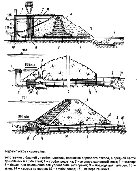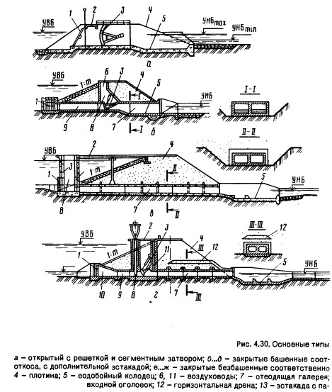При относительно малых диапазонах колебаний уровня верхнего бьефа водовыпуск гидроузла с грунтовой плотиной может представлять собой обычный открытый регулятор (рис. 4.30, а). Такие водовыпуски неоднократно строили на гидроузлах Мексики, Кубы, Индии. |
