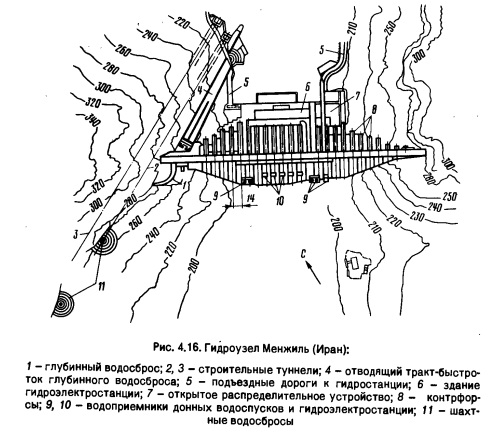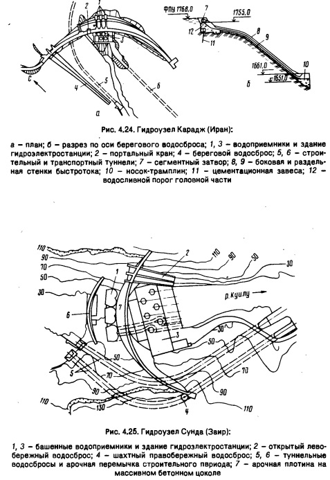 При составлении компоновок с одним береговым водосбросом его необходимо размещать так, чтобы направление движения сходящих с него струй воды совпадало с основным направлением течения реки. Как правило, такие водосбросы по конструкции представляют собой быстротоки, концевой участок которых имеет носок-трамплин двоякой кривизны. Примерами гидроузлов с одним береговым водосбросом служат гидроузлы Карадж (Иран), Сунда (Заир), Каштэлу ду Бодэ (Португалия). В число основных сооружений гидроузла Карадж входят: арочная плотина двоякой кривизны высотой 180 м при ширине по гребню 390 м, береговой водосброс по типу быстротока с большой длиной транзитной части, глубинный водовыпуск, приплотинная гидроэлектростанция мощностью 120 МВт (рис. 4.24).