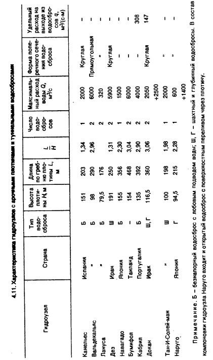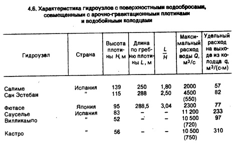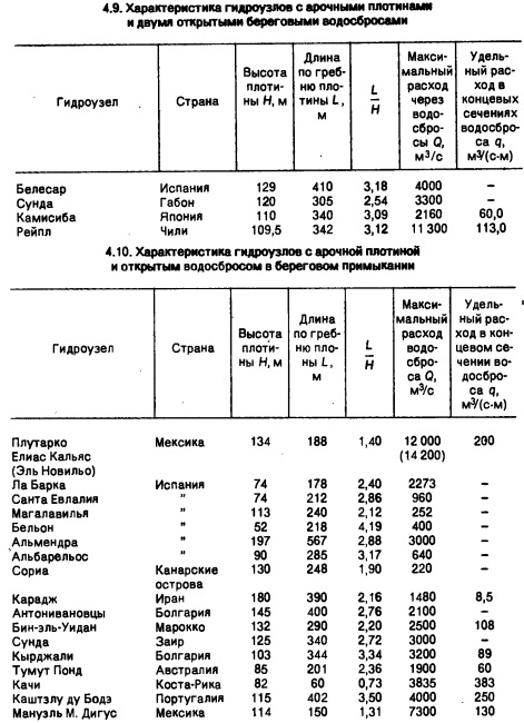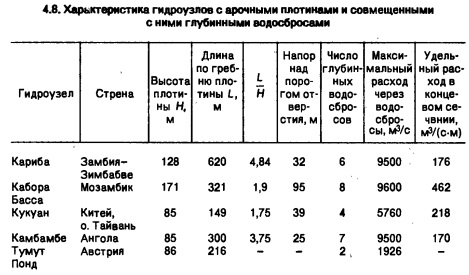 В связи с этим в 70-80-х годах построили гидроузлы, в которых основными водопропускными сооружениями были глубинные водосбросы (табл. 4.8).