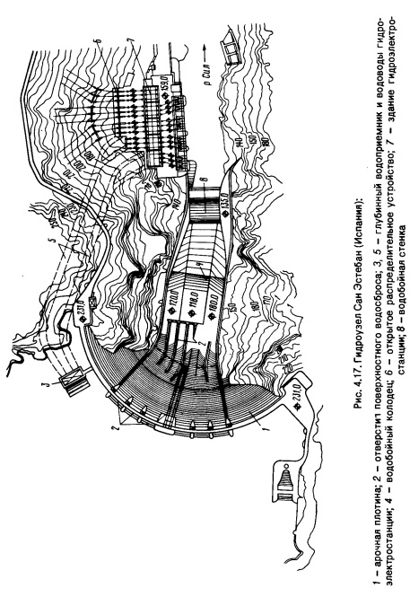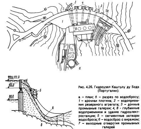 Гидроузел Сунда возведен в чрезвычайно благоприятных условиях. Его створ расположен в узком каньоне с расходом реки 10ОО м3/с; борта каньона сложены прочными кварцитами и гнейсами. Состав основных сооружений гидроузла (рис. 4.25): арочная плотина с массивным упорным гравитационным блоком-седлом, полная высота плотины 125 м, высота только арочной части 98 м; приплотинная ГЭС мощностью 1300 МВт; левобережный водосброс, рассчитанный на пропуск расхода 3000 м3/с. Из-за узости створа башенные водоприемники ГЭС размещены на одном фундаментном цоколе с плотиной, гидроагрегаты - в шахматном порядке. Максимальные расходы строительного перио-да пропускали через два туннельных водосброса. Гидроузел Каштэлу ду Бодэ (рис. 4.26) в число своих основных сооружений включает: арочно-гравитационную плотину высотой 115 м и длиной по гребню 402 м, в том числе 100-метровый правобережный