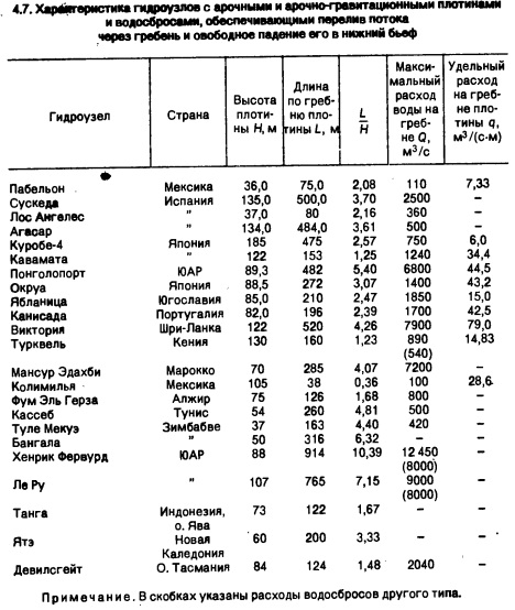 4.7. Характеристик гидроузлов с арочными и арочно-гравитационными плотинами и водосбросами, обеспечивающими перелив потока через гребень и овободное падение его в нижний бьеф Рассмотренные примеры показали, что компоновки гидроузлов с арочно-гравитационными плотинами обычно позволяют совмещать водосбросы со зданием ГЭС даже в сравнительно узком створе. Колодцы этих водосбросов полностью гасят избыточную энергию потока, мощность которого не меньше, чем на водосбросах гравитационных плотин, а его удельные расходы - самые большие в мире [200... 300 м3/(с-м) и более].