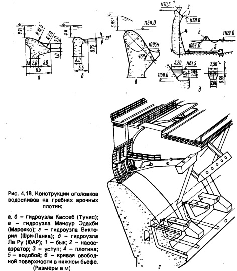 Как в странах с жарким климатом, так и вообще в мировой практике на гидроузлах с арочными плотинами наиболее широко распространены водосбросы со свободным переливом сбросных расходов через соответствующим образом оформленный гребень плотины и последующим падением струй в нижний бьеф в непосредственной близи от ее подножия (табл. 4.7, см. рис. 4.5, а). При небольших удельных расходах водосбросы подобного типа, как правило, проектируют нерегулируемыми,-то есть без затворов и с отметкой гребня водосливного оголовка, равной отметке НПУ. Чтобы несколько отбросить струи от плотины, оголовок гребня иногда оборудуют носком-трамплином (рис. 4.18; см. рис. 3.5, а). Крепление русла в этих случаях предусматривается не всегда. При значительных удельных расходах в нижнем бьефе устраивают надежное крепление, а на гребне плотины устанавливают затворы. Пример арочной плотины с нерегулируемым водосбросом на гребне - плотина японского гидроузла Куробе-4, имеющая поверхностный водослив длиной 125 м, рассчитанный на пропуск 750м3/с, и пять донных водоспусков. Ирригационный гидроузел Понголопорт (рис. 4.19), возведенный в ЮАР на реке Понгола, также имеет нерегулируемый переливной водо-сброс в центральной части плотины, рассчитанный на пропуск 6800 м3/с. Струи воды свободно падают с гребня плотины в водобойный колодец с полукруглой в плане стенкой. Длина колодца 32 м. Арочная плотина гидроузла Виктория (Шри-Ланка, см. рис. 4.18, г) имеет поверхностный водослив с достаточно большими удельными расходами [почти 80 м3/(с-м)), поэтому ее гребень с восемью отверстиями оборудован сегментными затворами 12,5x9,0 м. Каждый затвор имеет гидравлическое управление и противовес, уменьшающий его подъемное усилие. Водосливная часть устроена в центральной части плотины. Падающие струи гасятся в водобойном колодце длиной 110 м, заканчивающемся невысоким порогом. Оголовок водослива имеет в каждом пролете носок-трамплин и по два расщепителя с подводом воздуха.