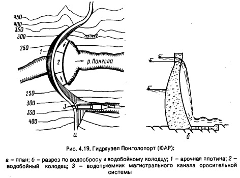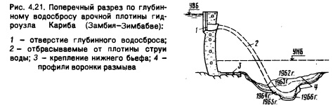 Характерный пример использования арочной плотины с глубинными водосбросами - гидроузел комплексного назначения Кариба (Замбия- Зимбабве) на реке Замбези (рис. 4.21). Состав его основных сооружений: арочная плотина двоякой кривизны в достаточно широком створе; подземная гидроэлектростанция мощностью 2100 МВт; шесть глубинных напорных водосбросов с конфузорным водоводом и плоскими затворами на выходе. Струи воды отбрасываются на 90 м от плотины. На участке у ее подножия предусмотрено короткое бетонное крепление. В период возведения гидроузла через его створ пропускали паводки расходом до 16 000 м3/с (против расчетного 8500 м3/с).