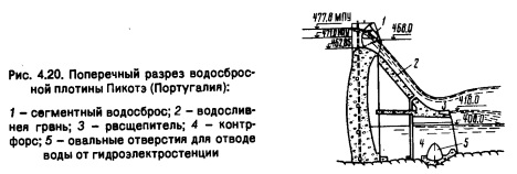 Несмотря на то что большинство арочных плотин выполняют с центральным размещением водосливного оголовка, известен ряд случаев, в которых последний устраивали асимметрично, в одном из примыканий плотины. Примером этому может служить водосброс гидроузла Мансур Эдахби (Марокко), находящийся на правобережной части арки. Чаще всего такое размещение водосброса обуславливалось либо неудовлетворительными геологическими условиями основания плотины в месте падения струй, либо нежеланием по каким-либо причинам вырезать верхний пояс арки. В большинстве случаев по возможности следует стремиться к центральному расположению водосброса. Однако необходимо учитывать, что при этом совмещение водосброса с плотиной и ГЭС приводит к образованию большого числа брызг, которые затрудняют работу ГЭС и ее оборудования, а также могут быстро вывести из строя трансформаторы и ЛЭП. Существует несколько гидроузлов с арочными или арочно-гравитационными плотинами, водосбросы которых имеют поверхностный перелив, транзитный участок сливной поверхности и гашение избыточной энергии потока, осуществляемое по схеме отброса струи с носка- трамплина. К ним относятся португальские плотины Пикотэ (арочная; Н = 100 м; L/H = 0,93; 0 = 10 400 м3/с; q= 173 м /с; имеется и туннельный водосброс, 0 = 600 м3/с; рис. 4.20) и Ванда Нова (арочно-гравитационная; Н = 97,0 м; L/H = 2,38; О = 1100м3/с; д = 70м2/с), а также испанская плотина Альдеадавила (арочно-гравитационная; Н = 139,5 м; L/H = 1,79; Q = 10 000 м3/с; q = 167 м2/с; имеется и туннельный водосброс, Q = 2800 м3/с). Однако в компоновках с арочными (и арочно-гравитационными) плотинами такая схема отброса струи применяется реже, чем для гидроузлов с гравитационными плотинами. Это объясняется усложнением конструкций для обеспечения приемлемого отброса струи. Раньше считалось, что в большинстве случаев поверхностные водосбросы в эксплуатации надежней глубинных и не требуют применения высоконапорных затворов, имеющих сложную конструкцию и подверженных кавитации. Однако накопленный опыт проектирования, строительства и эксплуатации большого числа гидроузлов с высокими и Рис. 4.20. Поперечный разрез водосбросной плотины Пикотэ (Португалия): сверхвысокими плотинами показал, что глубинные водосбросы имеют и целый ряд неоспоримых преимуществ, основные из которых следующие [61]: позволяют срабатывать водохранилище накануне паводка для срезки его пика, что особенно важно на многоводных реках с ливневым типом питания, доминирующих в регионах с жарким климатом; имеют обжатую конструкцию благодаря большим напорам и высо-ким скоростям течения, что дает определенные преимущества при их совмещении с тонкими арочными плотинами; дают возможность в большинстве случаев отказаться от устройства специальных водоспусков и водовыпусков, а также уменьшить число ярусов временных водосбросов строительного периода; отбрасывают струи непосредственно из глубинного отверстия без устройства носка-трамплина и сливной грани, имеющих значительную стоимость.