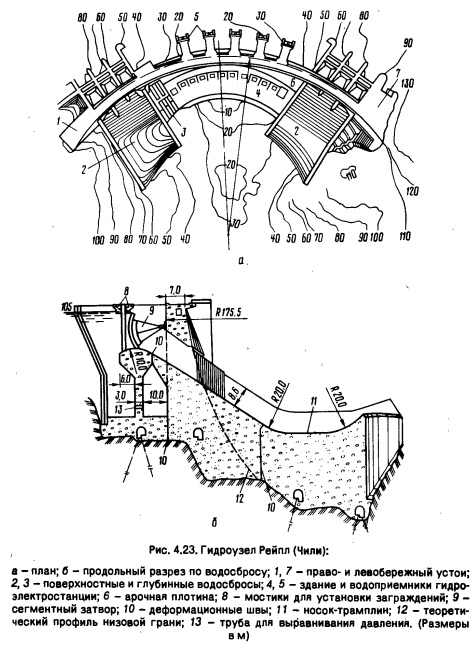 Водосброс гидроузла Камбамбе на реке Кванза имеет семь отверстий и пропускает расчетный расход, равный 9500 м3/с. Отверстия перекрываются плоскими затворами размером 8x10 м (рис. 4.22). В нижнем бьефе предусмотрено устройство бетонного крепления с водобойной стенкой высотой 5 м. Дополнительный туннельный водосброс максимальных расходов строительного периода (500 м3/с) в эксплуатационный период позволяет пропустить 800 м3/с. Итак, наиболее благоприятно эксплуатировать глубинные водосбросы арочных плотин можно в странах с жарким и умеренным мягким климатом. Устройство водосброса (поверхностного или глубинного) может неблагоприятно отразиться на напряженном состоянии арочной плотины и усложнить ее конструкцию. В связи с этим прорабатывали компоновочные решения гидроузлов с арочными плотинами и береговыми открытыми или закрытыми водосбросами. Гидроузлы с открытыми береговыми водосбросами можно разделить на две подгруппы: с водосбросами, располагающимися на обоих берегах реки (табл. 4.9); с одним водосбросом (табл. 4.10). Примером гидроузла с арочной плотиной и двумя береговыми водосбросами служит чилийский гидроузел Рейпл (рис. 4.23). У обоих водосбросов имеется достаточно длинная транзитная часть, завершающаяся носком-трамплином сложного очертания. На испанском гидроузле Белесар оба водосброса конструктивно совмещены с гравитационными устоями арочной плотины. В состав компоновки, помимо этих сооружений, еще входит подземная гидроэлектростанция мощностью 240 МВт. При разработке компоновок гидроузлов с двумя водосбросами их следует располагать симметрично относительно оси русла реки. Это позволяет относительно простыми и дешевыми средствами добиться благоприятных гидравлических условий работы нижнего бьефа, предупредить возникновение сбойных течений, свести к минимуму опасность размывов и возможных переформирований русла и берегов реки.